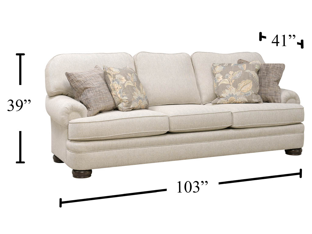 View Product CollectionThe 3620 Colchester River Sofa by Mayo Furniture embodies timeless elegance with its classic rolled arms and a 3-over-3 design featuring loose back and reversible seat cushions for versatile comfort. Upholstered in Revolution Performance Fabric, this sofa is designed to resist spills and stains, offering unmatched durability that exceeds the lifespan of standard fabrics. Its reinforced, layered arm tops are luxuriously padded with foam and fiber for added comfort, mirroring the plush support of its seat cushions. Complemented by large bun feet in a driftwood finish, the sofa exudes charm and sophistication. Backed by a lifetime warranty on its cushioning and sinuous spring construction, the Colchester River Sofa ensures enduring comfort and style, making it a valuable investment for any living space.
