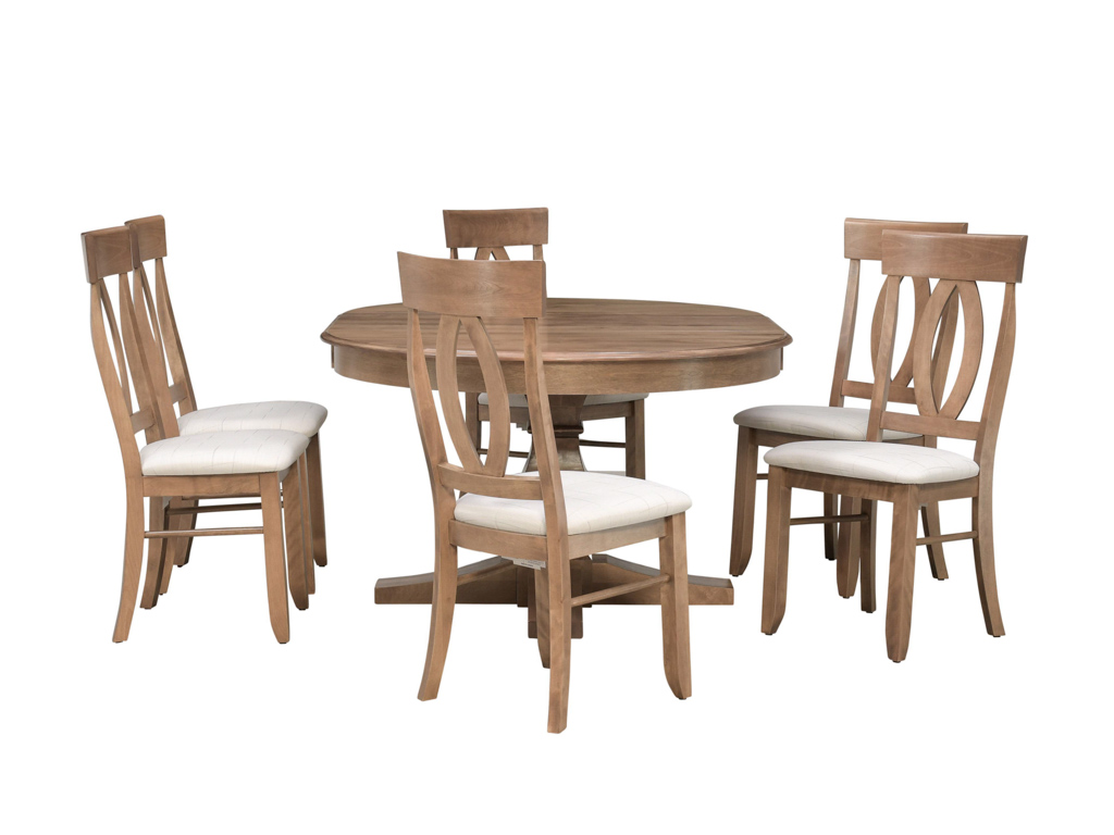 *Set pictured features the Ginger Washed finish with a 48-inch round table, leaf extension to 60 inches, and six 0100 dining side chairs with solid wood seats.