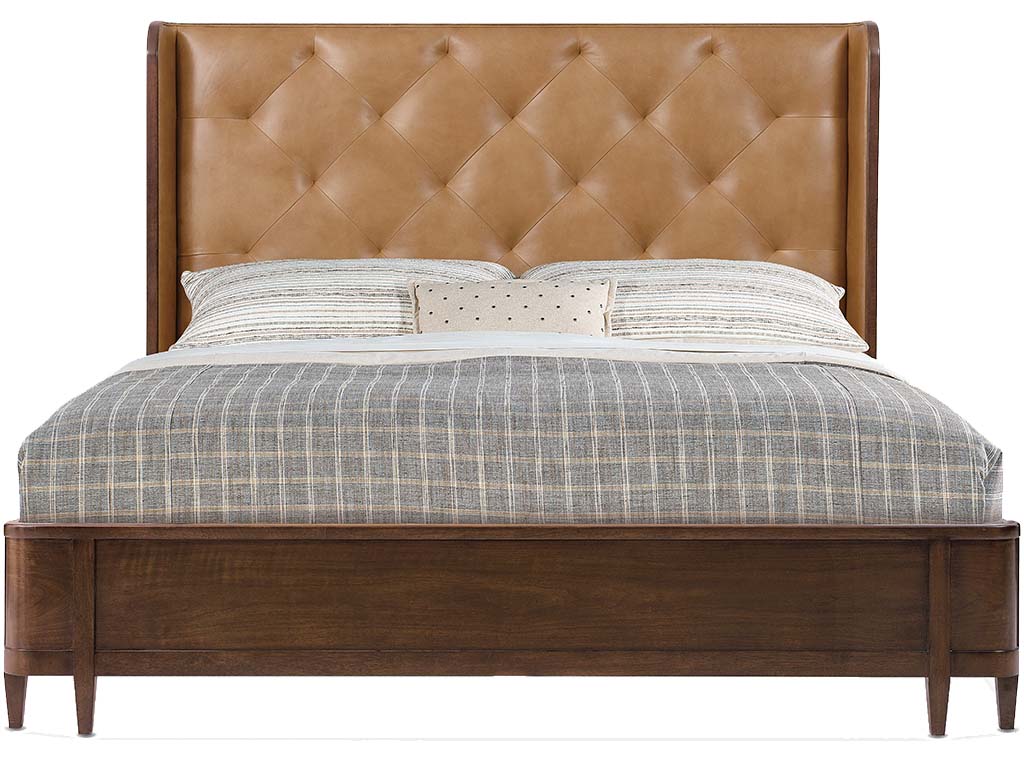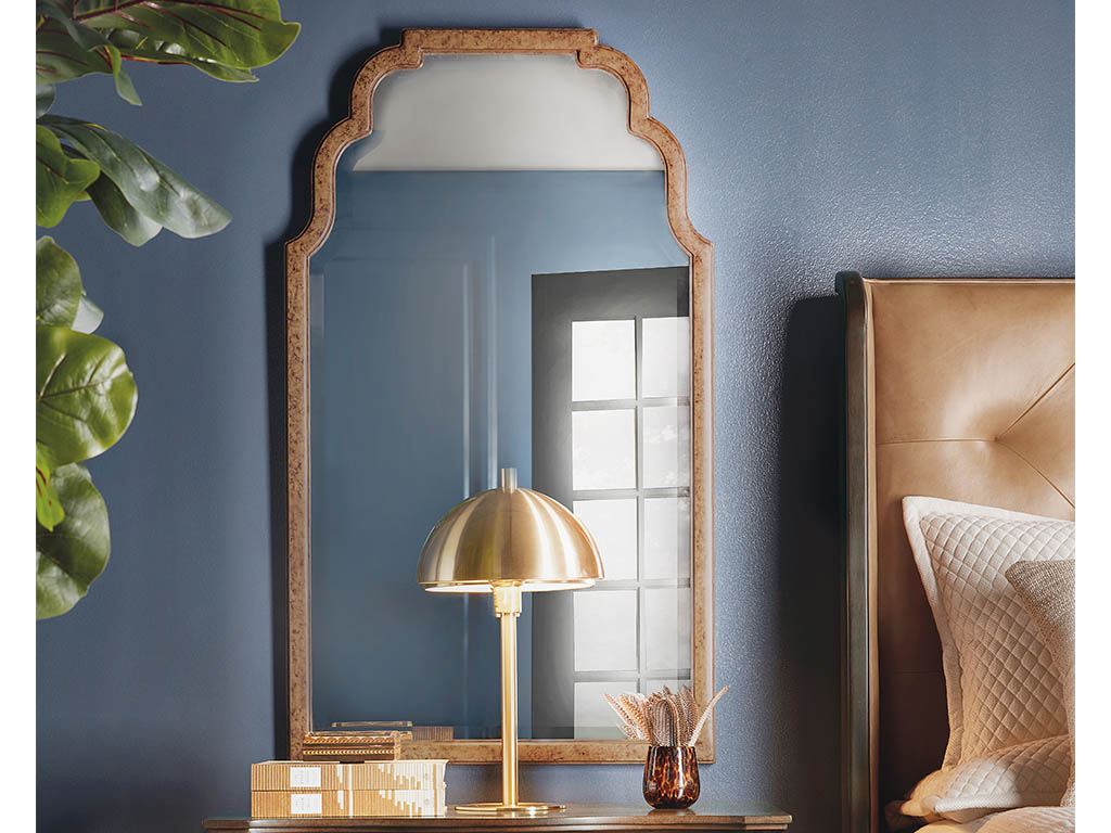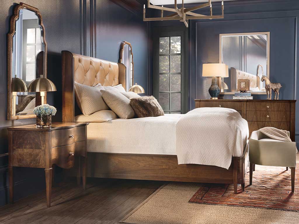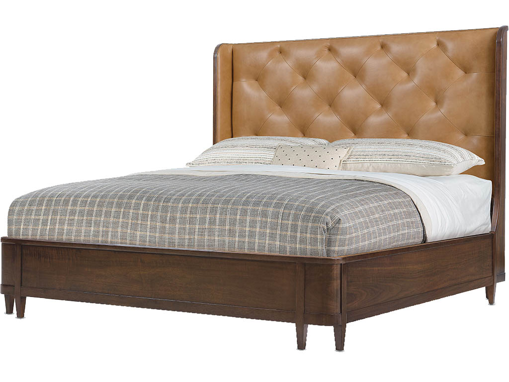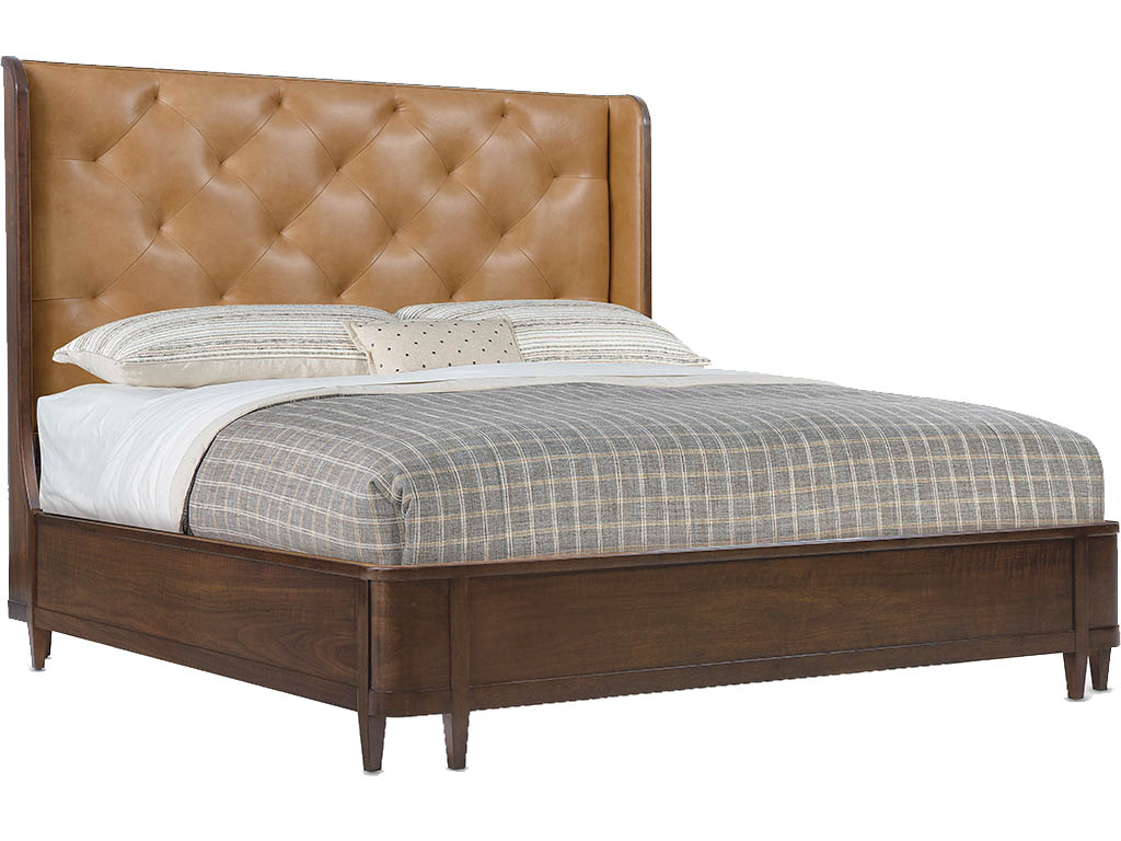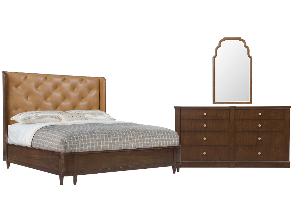 View Product CollectionThe Archives Dark Blond & Walnut 3-Piece King Bedroom Set by Hooker Furniture exudes luxury and timeless elegance, seamlessly blending figured walnut veneers with Dark Blond semi-aniline top-grain tufted leather for a refined yet inviting look. Anchoring the set, the King Leather Upholstered Shelter Bed features a gracefully curved winged headboard, footboard, and rails, all finished in Classic Walnut, with eight tapered legs adding a sophisticated touch. The Dark Walnut 8-Drawer Dresser complements the bed with its rich finish, custom satin brass hardware, and ample storage, including cedar-lined bottom drawers to preserve clothing and a built-in jewelry tray for organized, tangle-free valuables. Completing the set, the gracefully scalloped Tall Mirror showcases a Mottled Amber faux-tortoise shell accent and 1-inch beveled glass, balancing sophistication with function. Inspired by the "hipstoric" design trend, this collection merges modern aesthetics with historic influences, layering rich, authentic materials like top-grain leather, woven raffia, polished marble, and walnut veneers for a sense of structured elegance with a hint of intrigue.