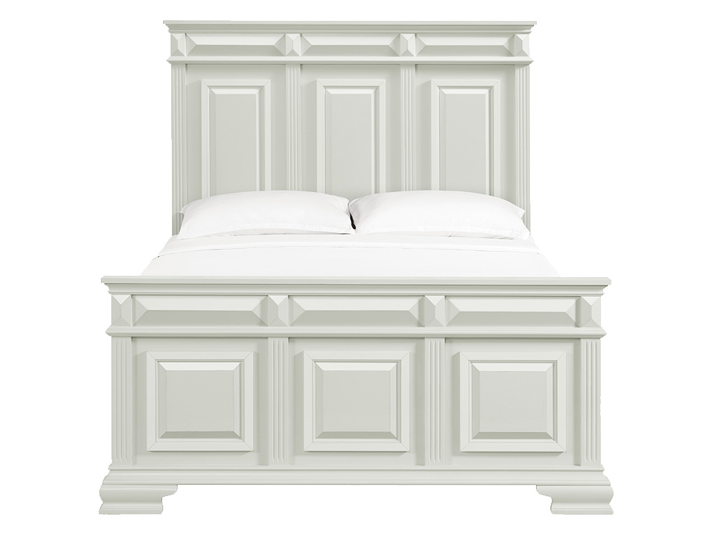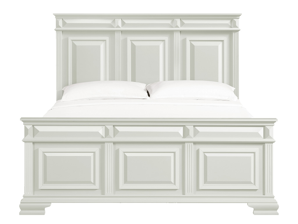 The three-panel headboard adds height and graceful structure, creating a natural focal point that feels grand without being overwhelming. It looks just as lovely layered up with plush pillows and a quilted coverlet as it does dressed simply in crisp white linens. The matching three-panel footboard carries those same beveled details, tying the whole design together in a balanced, thoughtful way.