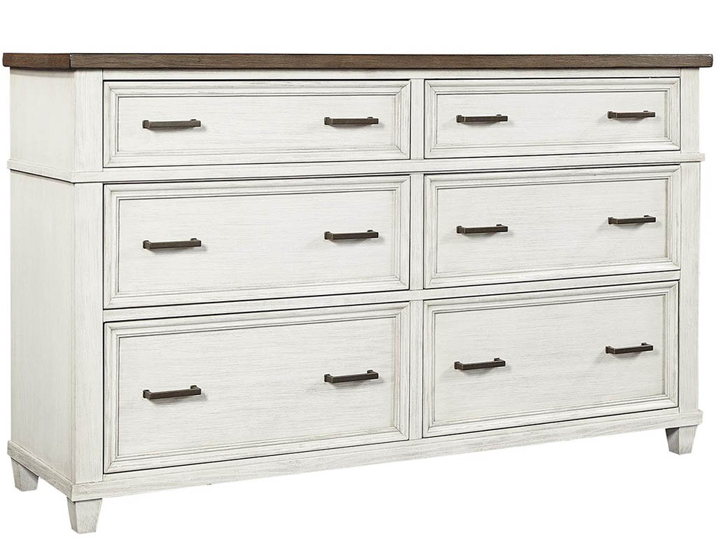 The Caraway 6 Drawer Dresser by Aspenhome is a stunning addition to any bedroom, featuring an aged ivory finish with a warm rustic brown top that adds a touch of timeless elegance. The brass bar pull hardware complements the aesthetic, creating a perfect blend of classic and contemporary styles. Designed for durability, the dresser incorporates dovetail joinery, ensuring supreme strength. The Cedar Lined Bottom Drawers not only protect clothing and linens but also serve as an ideal storage solution for seasonal items, shielding them from unwanted odors and moths. The top two drawers are felt-lined, offering a gentle environment for delicate items like jewelry, reducing movement and enhancing protection. The dresser's premium full-extension, steel ball-bearing drawer slides provide a quiet, smooth, and reliable function, built to withstand daily use. Pair it with other pieces from the Caraway Bedroom Collection to achieve a farmhouse-inspired look with a modern and updated feel.