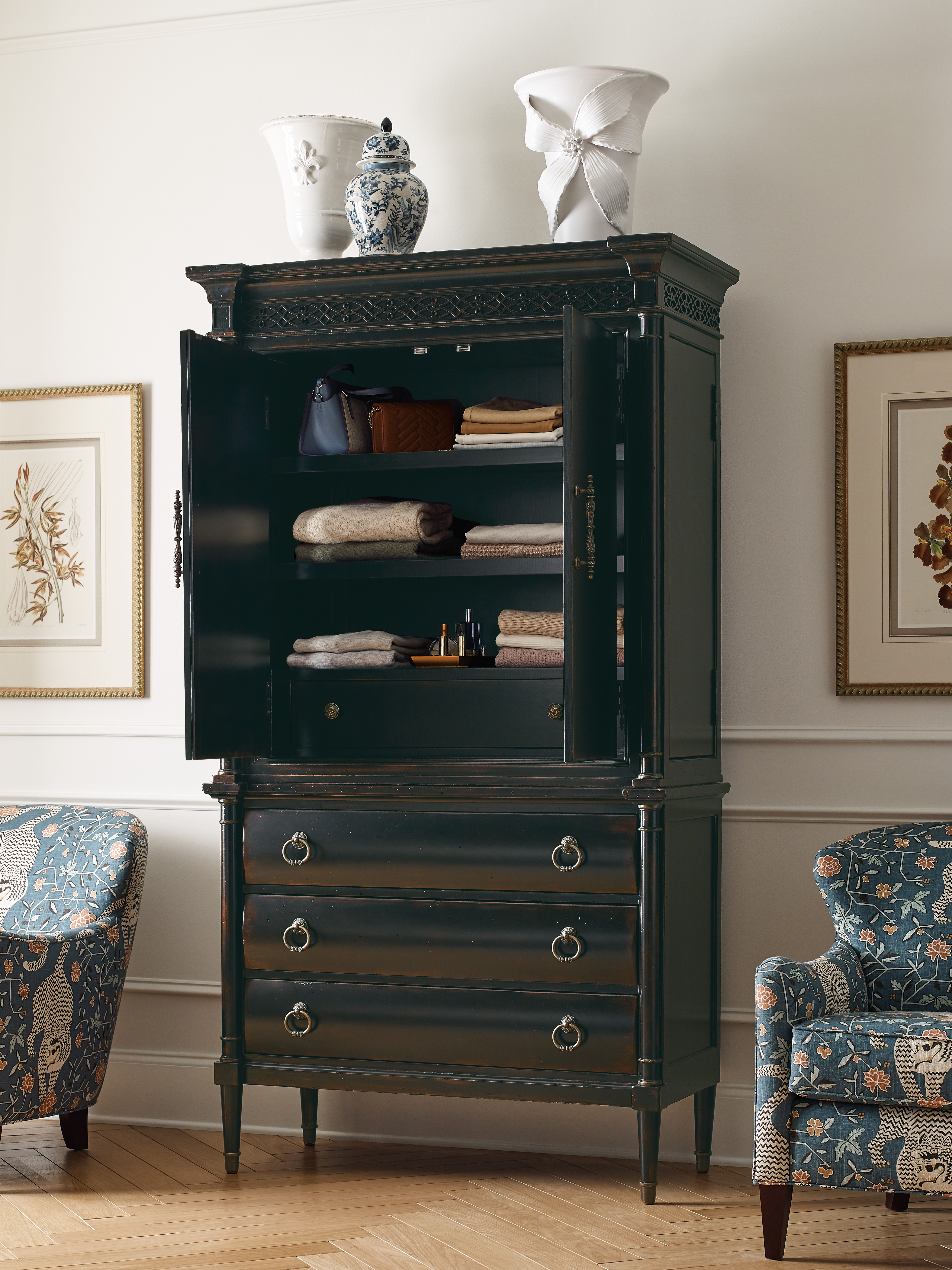 View Product CollectionThe Charleston Black Cherry Jewelry Armoire by Hooker Furniture brings the charm of Southern tradition right into your bedroom, rich, warm, and beautifully detailed. Its Black Cherry finish hints at the glow of cherry wood beneath a gently aged patina, giving the whole piece an heirloom quality that feels both storied and timeless. If you love classic design with thoughtful modern touches, this armoire fits right in.
