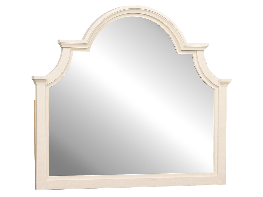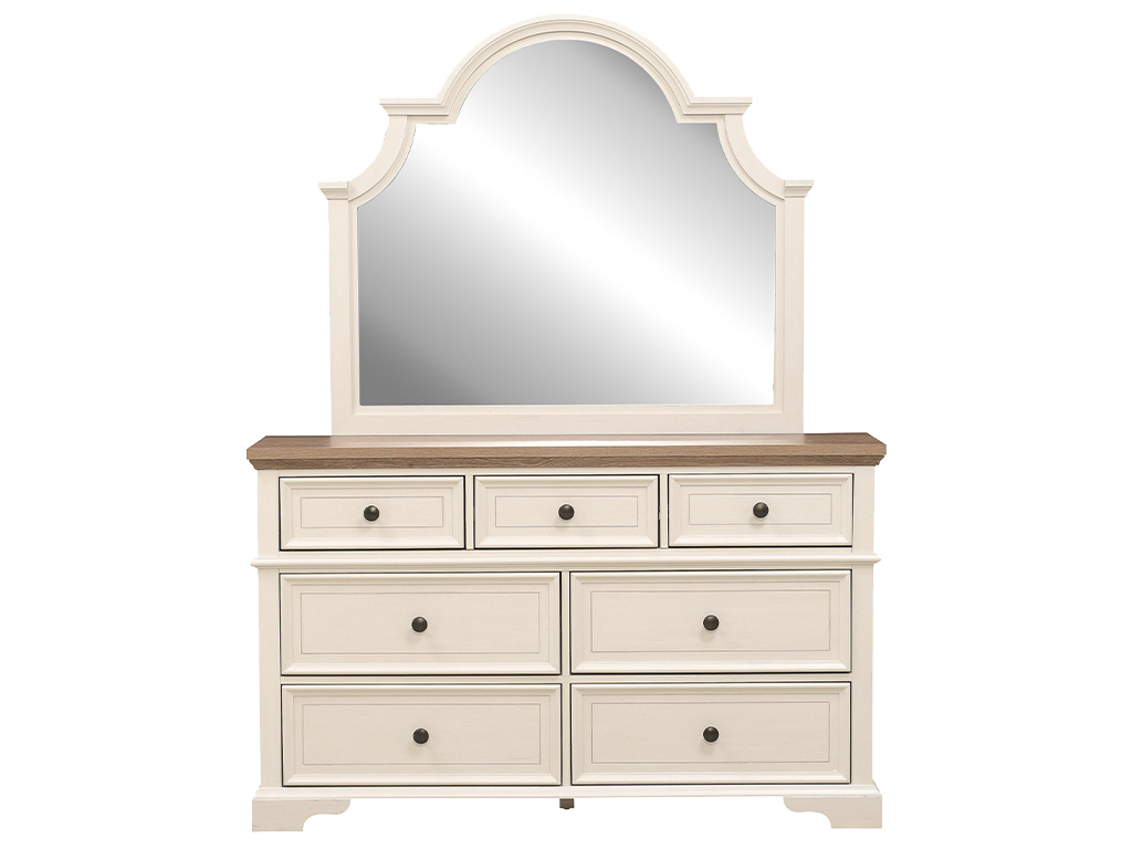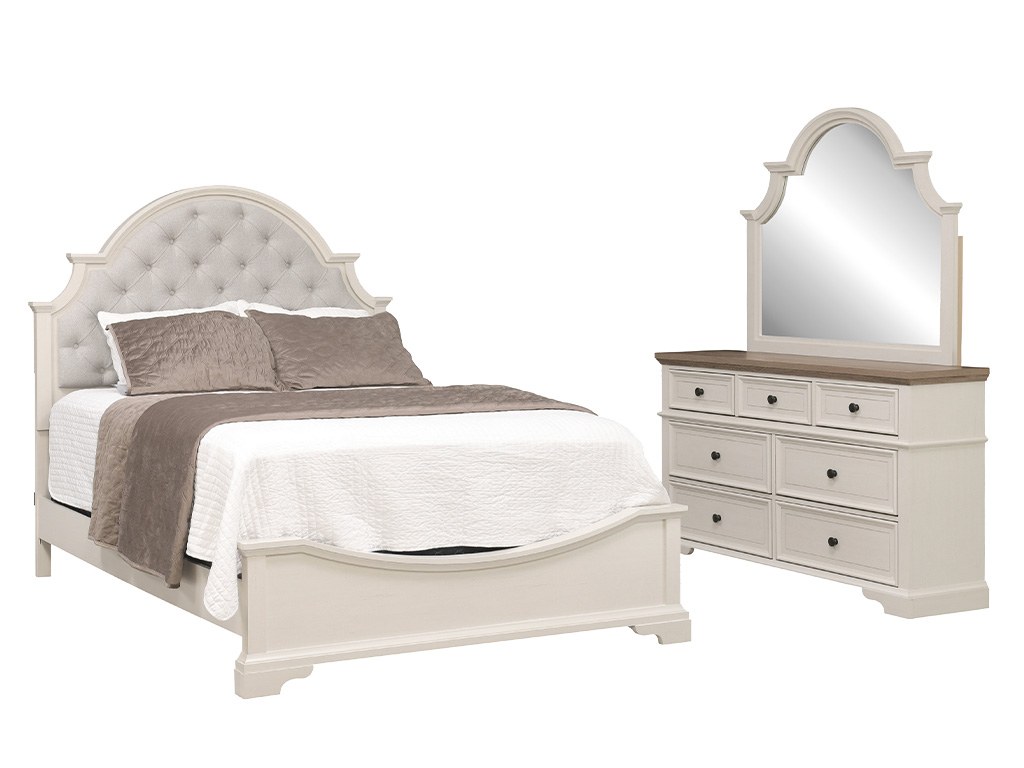 The dresser’s standout two-tone finish, with a rich brown top and creamy off-white base, adds striking contrast and enhances any décor. Paired with a coordinating mirror in a matching off-white finish, the look is effortlessly cohesive. The arched headboard, wrapped in plush upholstery with diamond button tufting, offers a cozy, upscale touch. Notched corners and a gently bowed footboard add elegant architectural detail.
