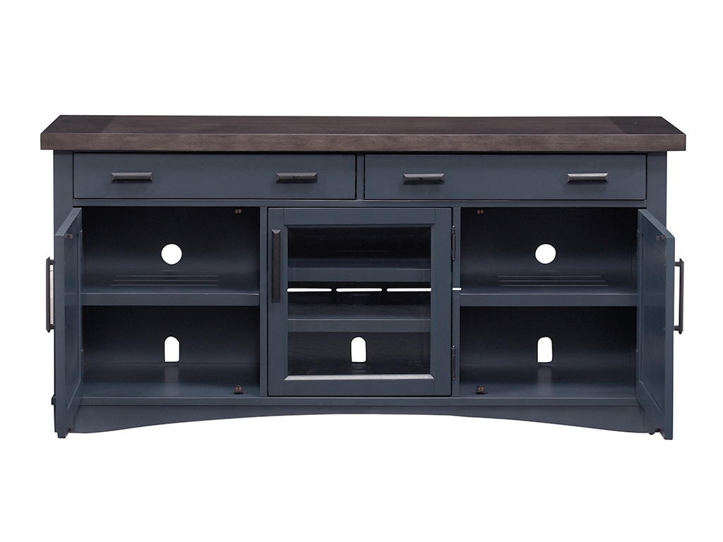 View Product Collection Looking to give your living room a fresh makeover? Take a look at the Americana Denim 63 TV Console by Parker House. With a wood-grain top and rich blue painted finish, this media console breathes new life into your style. Two drawers keep you organized while the cabinets let you put away your media essentials. Its simple design and chic finish let you put this TV console in a media room, family room or even home office.