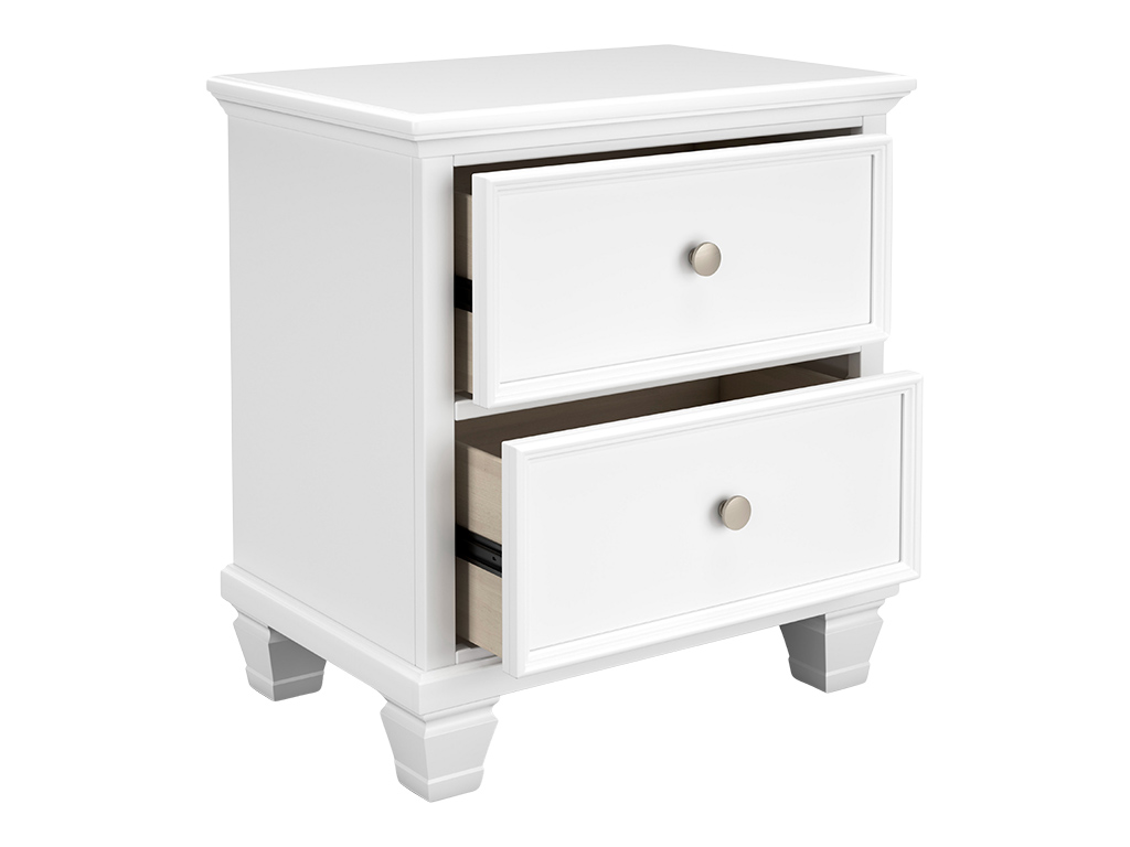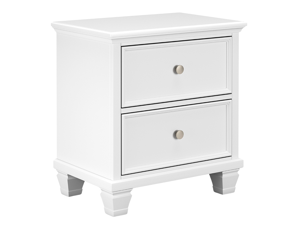 View Product CollectionExuding a timeless casual design, this Fortman Nightstand by Signature Design by Ashley is ready to define your bedroom space. It easily adapts to a variety of design styles and colors, combining a clean, contemporary white finish with framed drawer fronts and round metal knobs. Featuring two storage drawers with dovetail construction and traditional tapered feet, this nightstand is sure to bring elegant simplicity to your bedroom.
