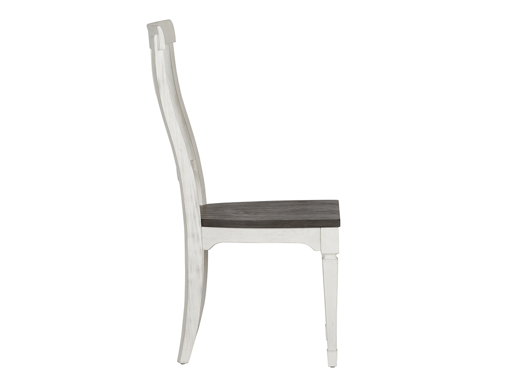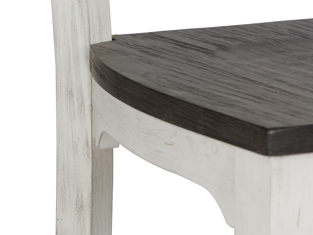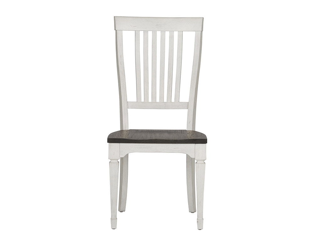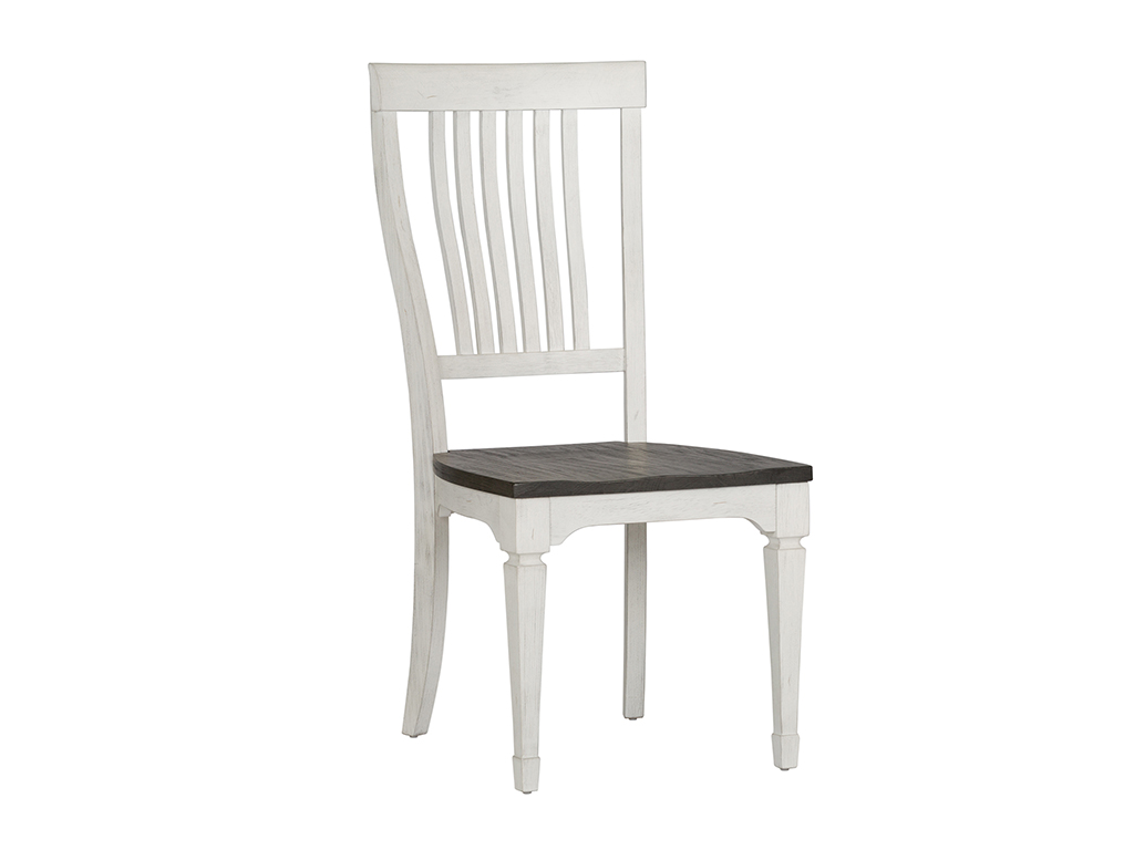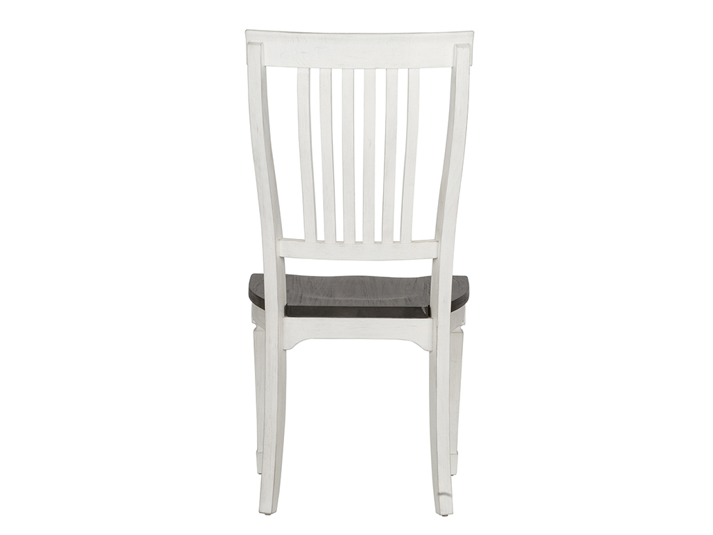 View Product CollectionSit in comfort and style with the Allyson Park Slat Back Side Chair by Liberty Furniture. Crafted from poplar and rubberwood solids, this two tone dining chair features a wire-brushed white finish with a charcoal seat. Designed for both elegance and function, it includes nylon chair glides to protect your floors, a curved wooden seat for added comfort, and a classic slat back. Supported by square tapered legs, this chair blends a timeless look with a casual feel, making it a perfect addition to any dining space.
