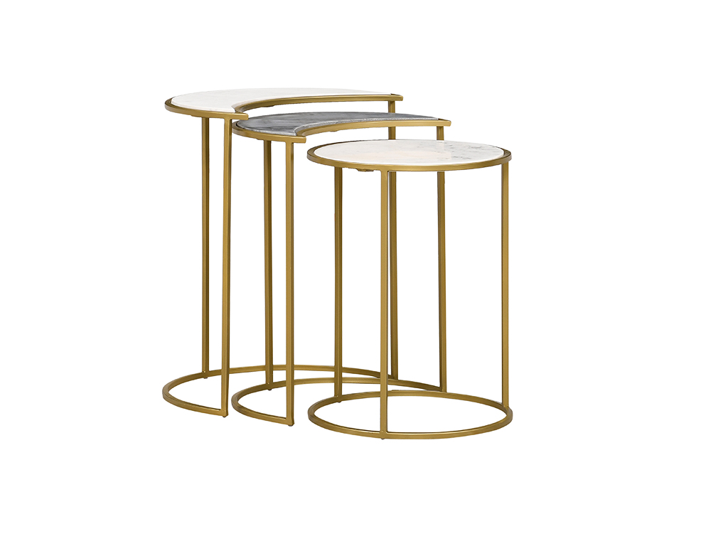 View Product CollectionMake a sleek and elegant statement with this set of three Astronomy Nested Accent Tables in an eye-catching crescent shape. These tables from the Crestview Collection brand are the perfect addition for any astronomy aficionado. White, gray and black marble tabletops make a standout impression while blending with contemporary decor. Each table is supported by a luxurious plated gold frame made from iron, and you can display the tables together or apart. No matter where the placement, they are sure to shine!