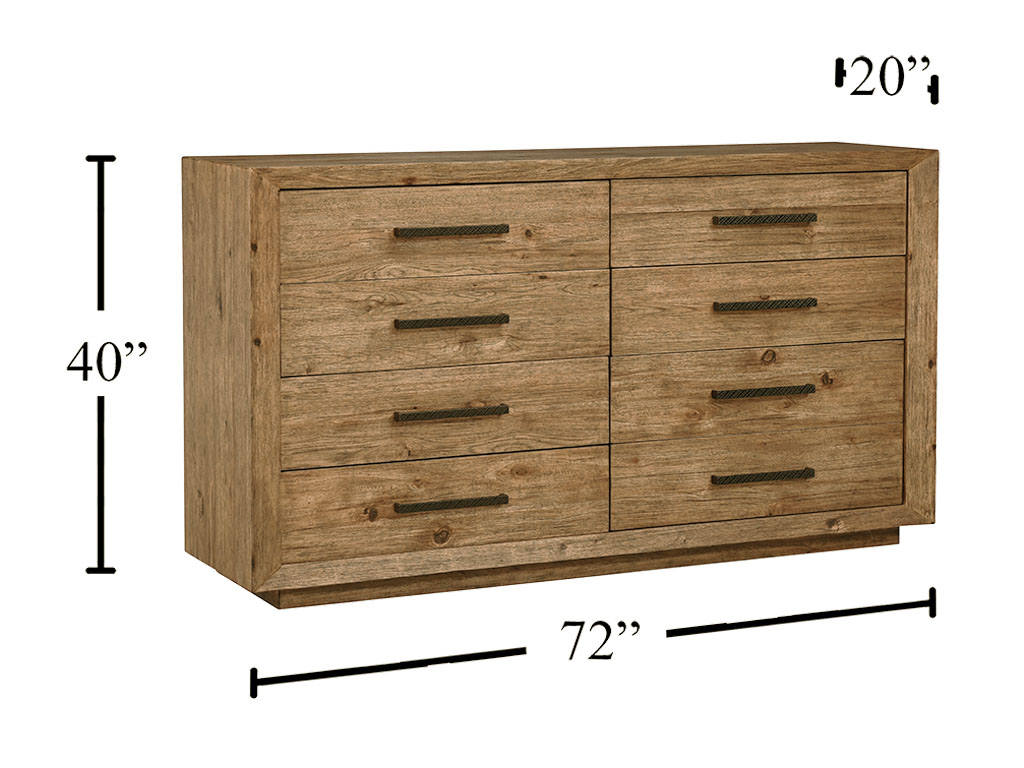 View Product CollectionRooted in the warmth and authenticity of rustic design, the Big Sky Eight-Drawer Dresser by Hooker Furniture offers both beauty and function for your bedroom. Crafted of Pecky Hickory veneers and cedar with a solid-wood edged top, it features Hooker’s Vintage Natural finish—a medium wood tone that highlights the character of natural grain with hand-applied distressing. The clean-lined silhouette feels timeless, while dark brushed bronze bar pulls add a touch of texture and depth. With thoughtful storage details like felt-lined drawers, cedar lining, and a jewelry tray, this dresser keeps your essentials organized while enhancing your space with lasting craftsmanship.