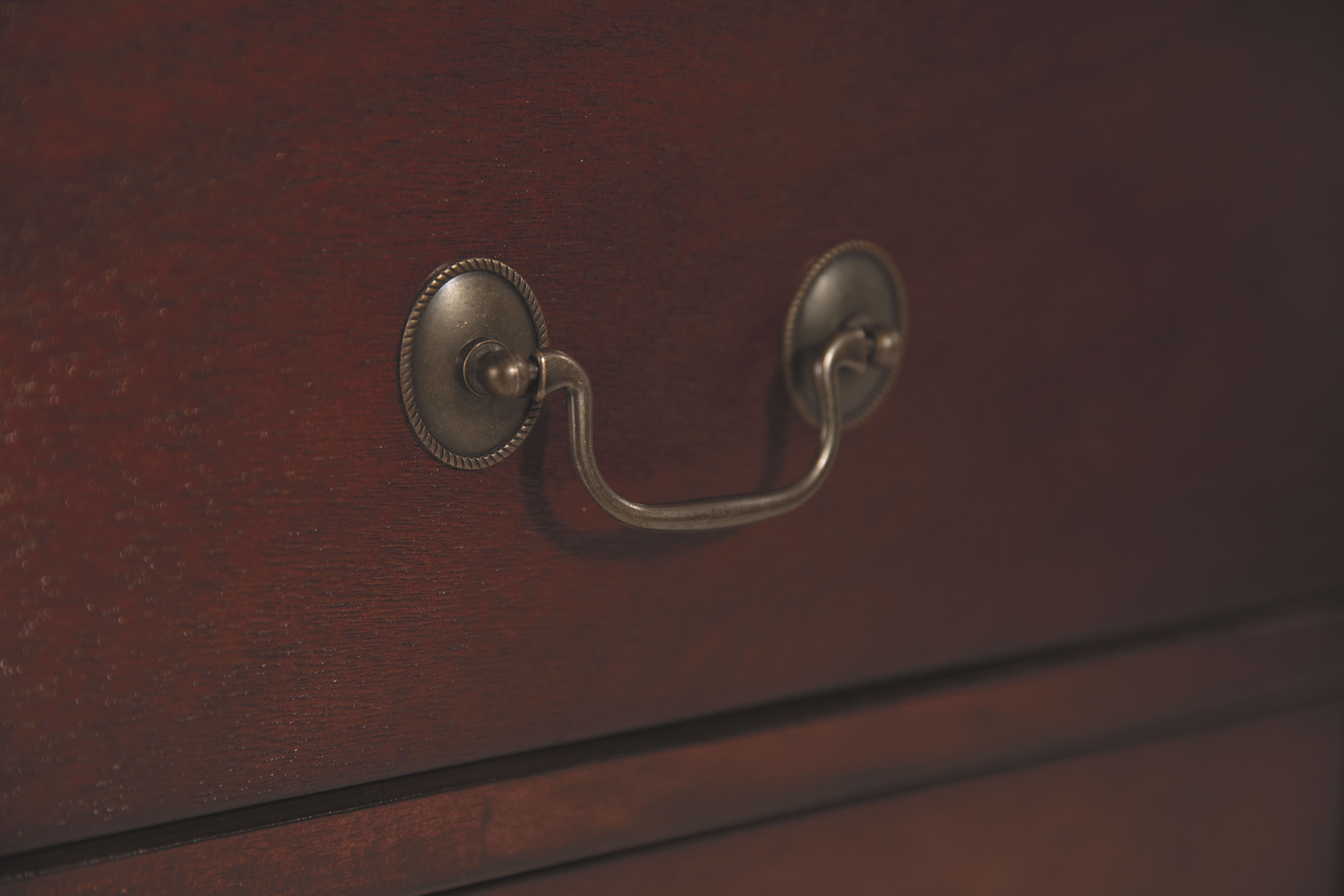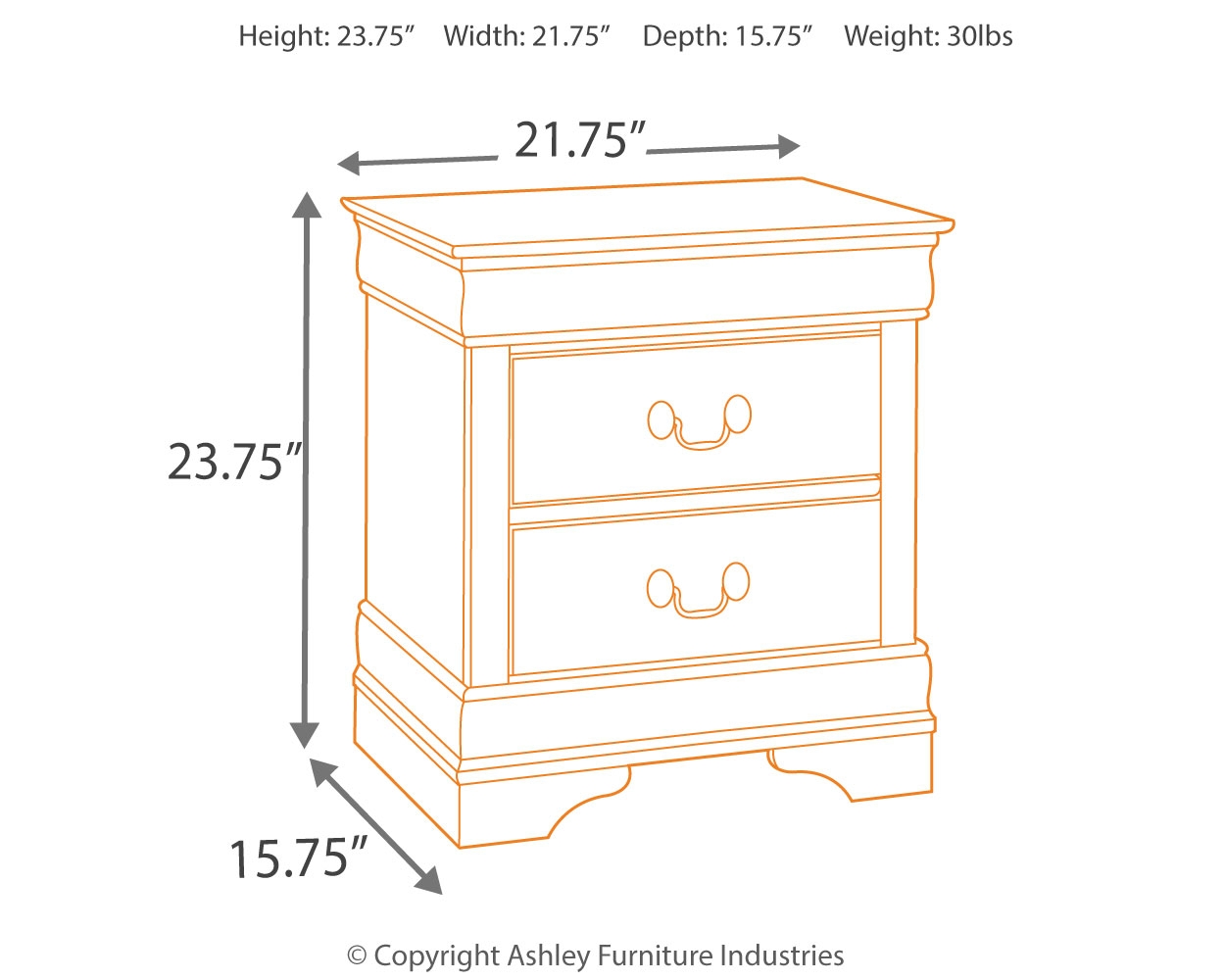 View Product CollectionThe Alisdair 2 Drawer Nightstand from Ashley Furniture is the embodiment of classic elegance and practicality. Featuring mid-19th century Louis Philippe-style moulding, it exudes a timeless and old-world charm that never goes out of style, making it a stunning addition to any bedroom decor. With its two spacious drawers, this nightstand provides ample storage space for bedside essentials, ensuring a clutter-free and organized bedroom. The antique bronze-tone hardware on the drawers not only adds an elegant and antiquated feel but also creates a striking contrast with the deep cherry brown finish. This nightstand not only elevates your bedside storage capabilities but also imparts a sense of timeless charm, adding warmth and sophistication to your space. It's the perfect choice for those who value both style and functionality in their furniture.