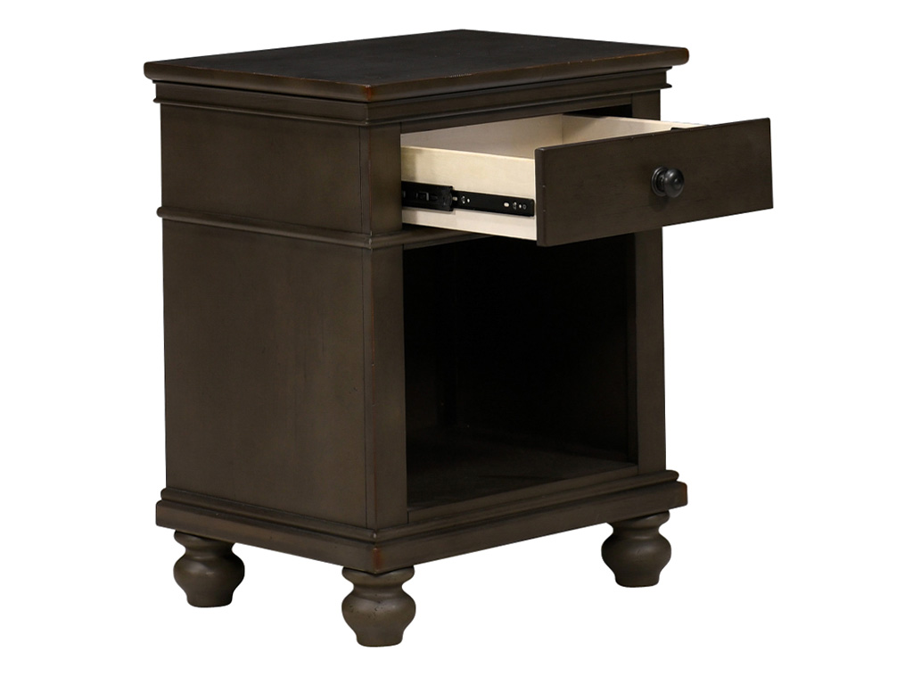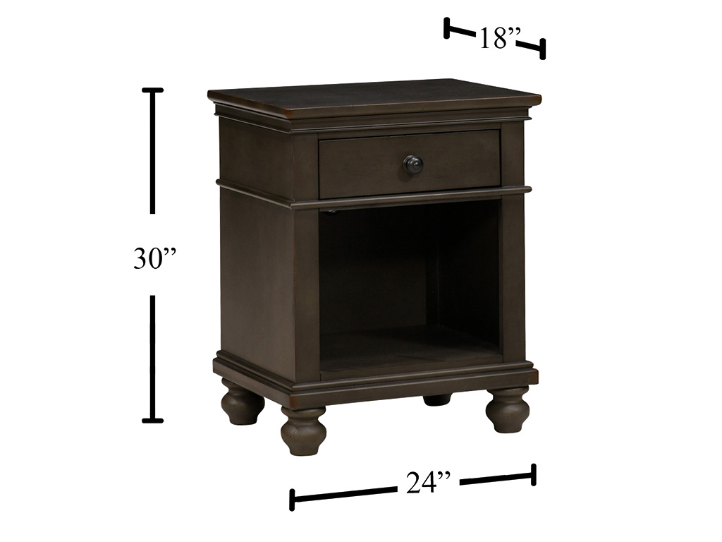View Product CollectionThe Oxford Peppercorn 1 Drawer Nightstand by Aspenhome Furniture is made with poplar solids for a durable piece to withstand daily use effortlessly. It features a felt lined top drawer with, open storage area at its base that is perfect for stowing current late night reading materials or for displaying an accent to tie the room together. Pair with other pieces from the Oxford Bedroom Collection to create your own relaxing oasis!