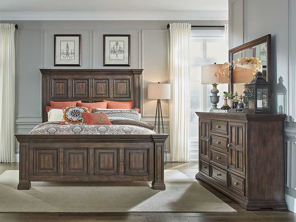 The Big Valley Brownstone 3-Piece Panel Bed with Dresser and Mirror by Liberty blends classic elegance with rustic charm, creating a timeless statement for your bedroom. Crafted from rubberwood solids with birch veneers, this bedroom set showcases a rich brownstone finish with heavy distressing, enhancing its antique-inspired appeal. The centerpiece of this collection is the grand mansion-style panel bed, featuring intricate detailing, heavy crown molding, and square post pilasters that replicate the look of a salvaged antique door. The coordinating dresser offers ample storage with six spacious drawers and two wood-framed doors, each with an adjustable shelf for added organization. Premium felt-lined top drawers and cedar-lined bottom drawers provide extra protection for your belongings. The beveled-edge mirror completes the set, attaching securely to the dresser with the included bolt-on supports. Accented with antique pewter knob hardware and resting on sturdy block feet, this beautifully crafted collection is built to last for generations. With its warm, sophisticated finish and architectural detailing, the Big Valley Brownstone 3-Piece Panel Bed Set brings both character and functionality to your home.