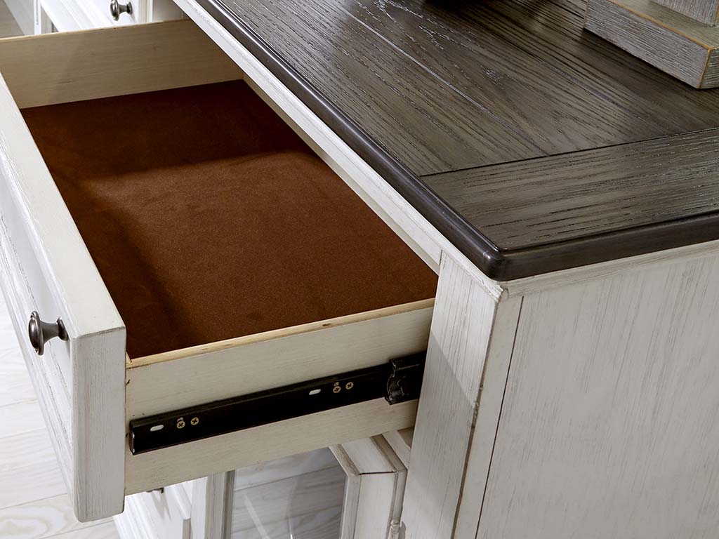 View Product CollectionReinvent your style with a standout piece the Allyson Park Buffet by Liberty Furniture. This buffet is crafted from poplar and rubberwood solids, featuring cathedral white oak tops. It boasts a wire-brushed charcoal planked top and a wire-brushed white base with brown undertones, all highlighted by antique pewter knob and drop-bail hardware. The design includes an open center shelf with wine storage, flanked by two wood-framed glass doors. Behind each door, you’ll find an adjustable shelf for customizable storage. Three wood-framed full-extension drawers complete the piece, with the top two drawers lined with felt for added elegance. The Allyson Park Buffet by Liberty Furniture offers a charming cottage style that complements any setting, from coastal cottages and mountain retreats to industrial lofts.