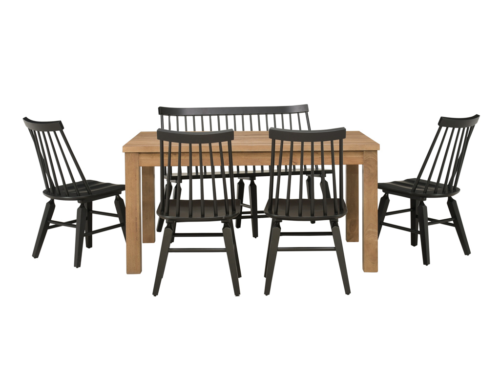 - Style: Modern farmhouse dining set with Windsor inspired spindle back chairs and a matching bench