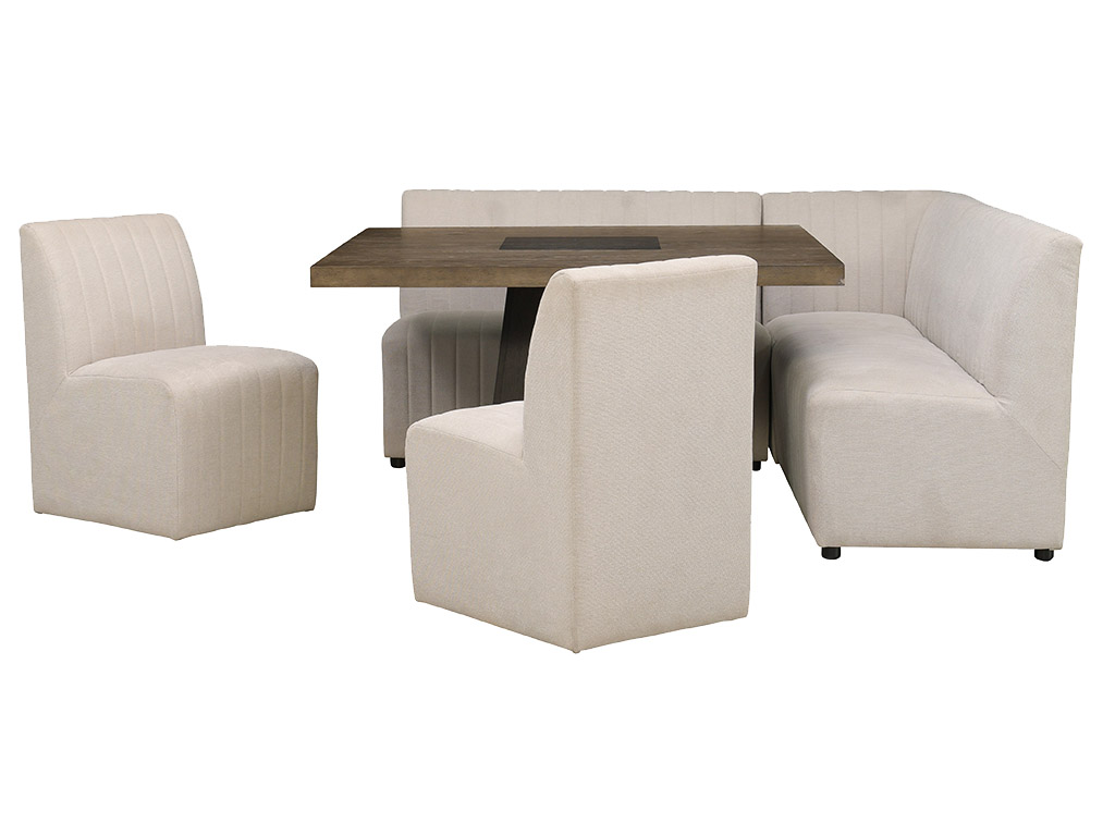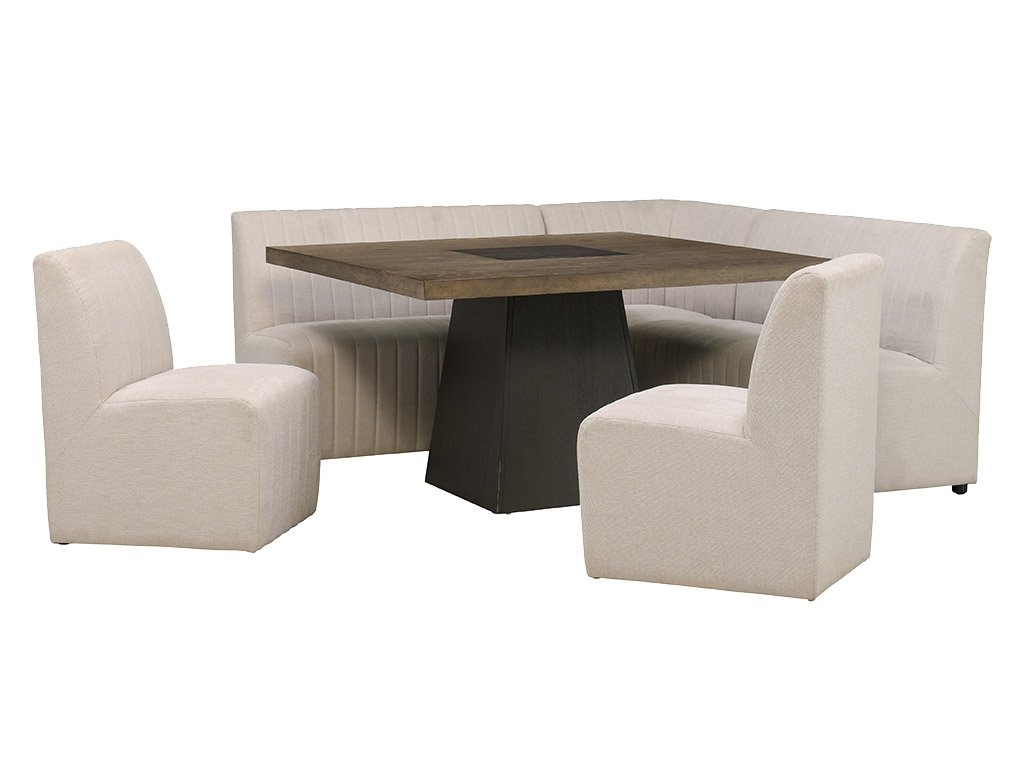View Product CollectionThe Jemma 6 Piece Dining Set by Elements International is the perfect blend of comfort and style, designed to enhance any dining space, large or small, without compromising on elegance. The square table features a stylish pedestal base that provides stability and adds a touch of sophistication to your dining area. The two-tone espresso and gray table top enhances its visual appeal, creating a striking contrast that draws the eye. Two beige linen upholstered dining benches are joined together with a matching beige corner dining chair, forming an L-shaped seating space that comfortably accommodates five. Two side chairs, channeled and upholstered in the same beige linen, complete the look, making this set a great option for those seeking a contemporary, high-design look in a limited dining room space.