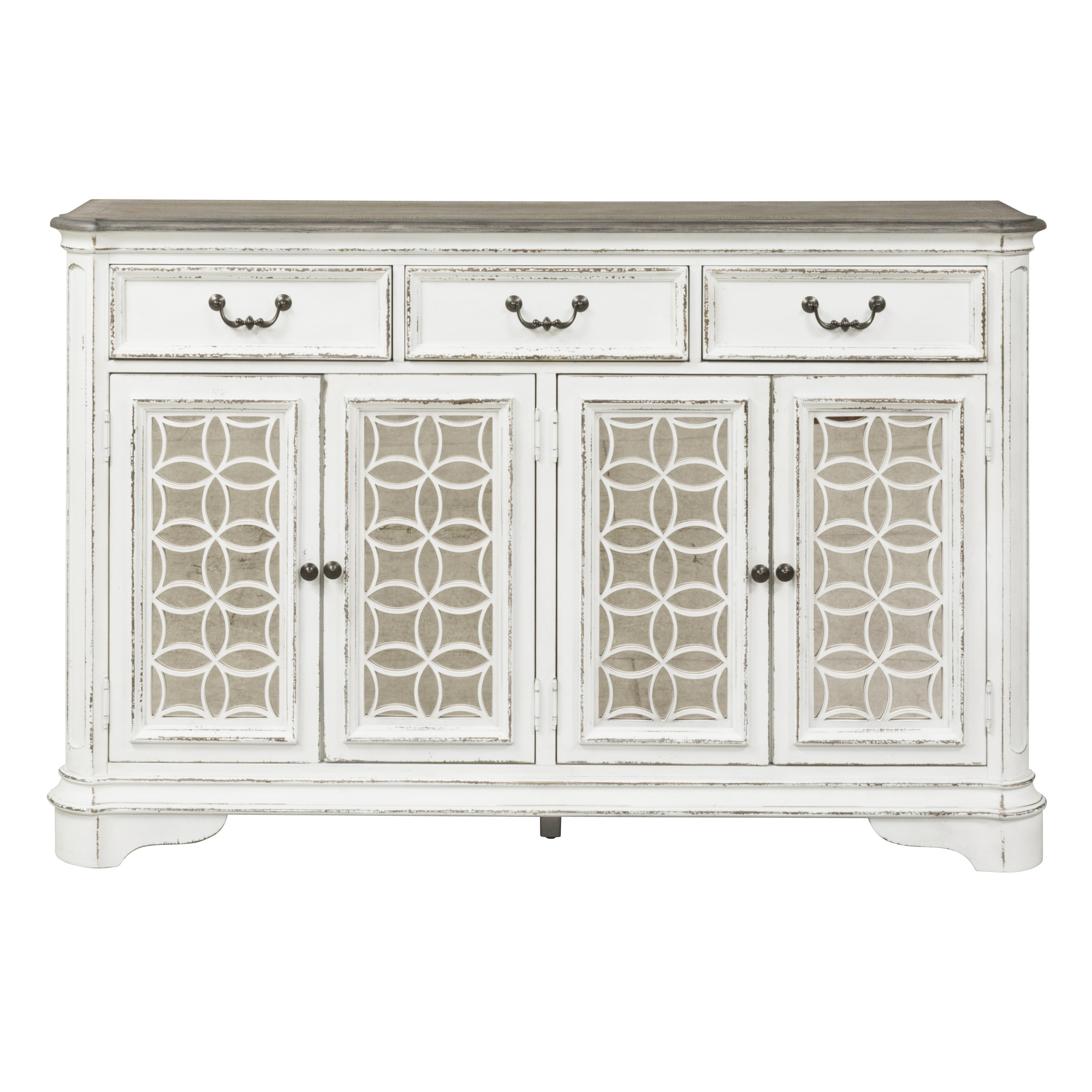 Make entertaining easy and stylish with the Magnolia Manor Hall Buffet. Use this piece in the entryway as a statement piece or as a hosting buffet in your dining room. Featuring a blending of European influences the hall buffet is crafted of poplar solids and white oak veneers finished in a weathered brown and antique white finish with heavy chipping. Four doors create a unique design opportunity with an overlay grid pattern that will work with the mirrored panel or wood tone panel for two completely different looks. Behind the doors are 4 adjustable shelves for storage. The case is rounded out with three drawers that feature full extension drawer guides and a fully finished interior. A showstopper piece that you and your family will enjoy for years to come!