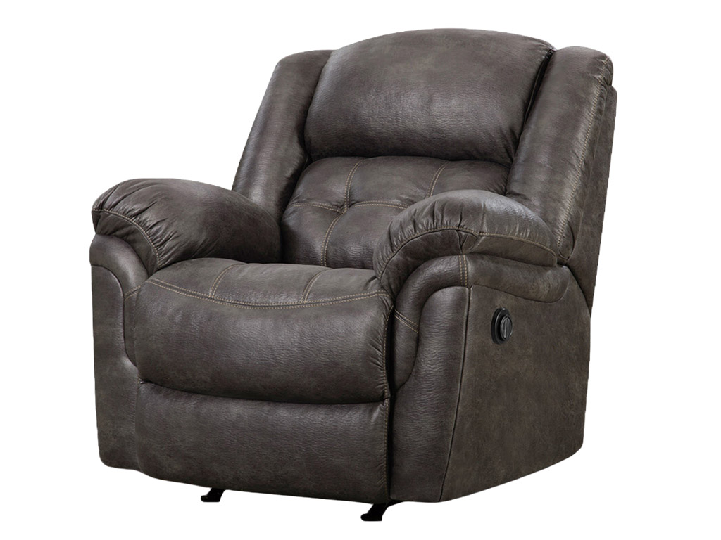The Frontier Power Rocker Recliner by HomeStretch epitomizes comfort and style with its array of luxurious features. Crafted with meticulous attention to detail, it boasts double needle accent stitching that adds a touch of sophistication to its design. The tufted seats and back provide both visual appeal and extra cushioning for maximum comfort. Supported by plush, pad-over chaise leg support, this rocking recliner offers unparalleled relaxation. Upholstered in 100% polyester, it ensures easy maintenance, making it ideal for busy households. The rocking feature adds an extra touch of comfort and relaxation, allowing you to unwind effortlessly. Its Charcoal Gray faux leather covering exudes the look of genuine leather at a fraction of the cost, adding a touch of luxury to any living space. With the Frontier Power Rocker Recliner, comfort, style, and relaxation merge seamlessly to create the ultimate lounging experience.