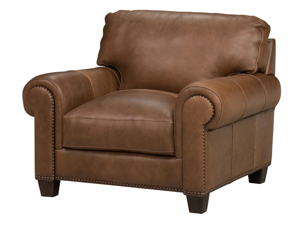 View Product CollectionWho says exquisite style can't also be comfortable? The Madison Pecan Leather Chair from Soft Line America offers rich, supple grain leather and plush cushions, and adds warmth and the sophisticated classic look to your living space only leather can offer. Exposed dark wood legs and rolled arms beautifully complement the antique-toned nail head trim. Pair with the matching Madison Pecan Leather Ottoman to really complete the look.