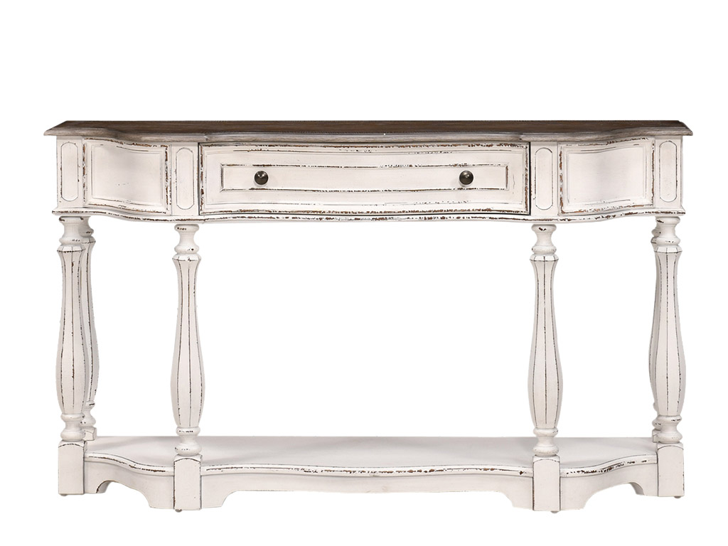 View Product CollectionAntique farmhouse meets traditional style with the Magnolia Manor 56" Hall Console Table by Liberty Furniture. Ideal for an entry way or as an easy way to dress up a hallway, this accent piece brings any look to life. The Magnolia Manor collection is crafted from poplar solids with white oak and birch veneers. With French and English Dovetail construction, this console table features a distressed antique white finish with a darker weathered brown top. Center drawer and lower wooden shelf give you space for storage or home accents.