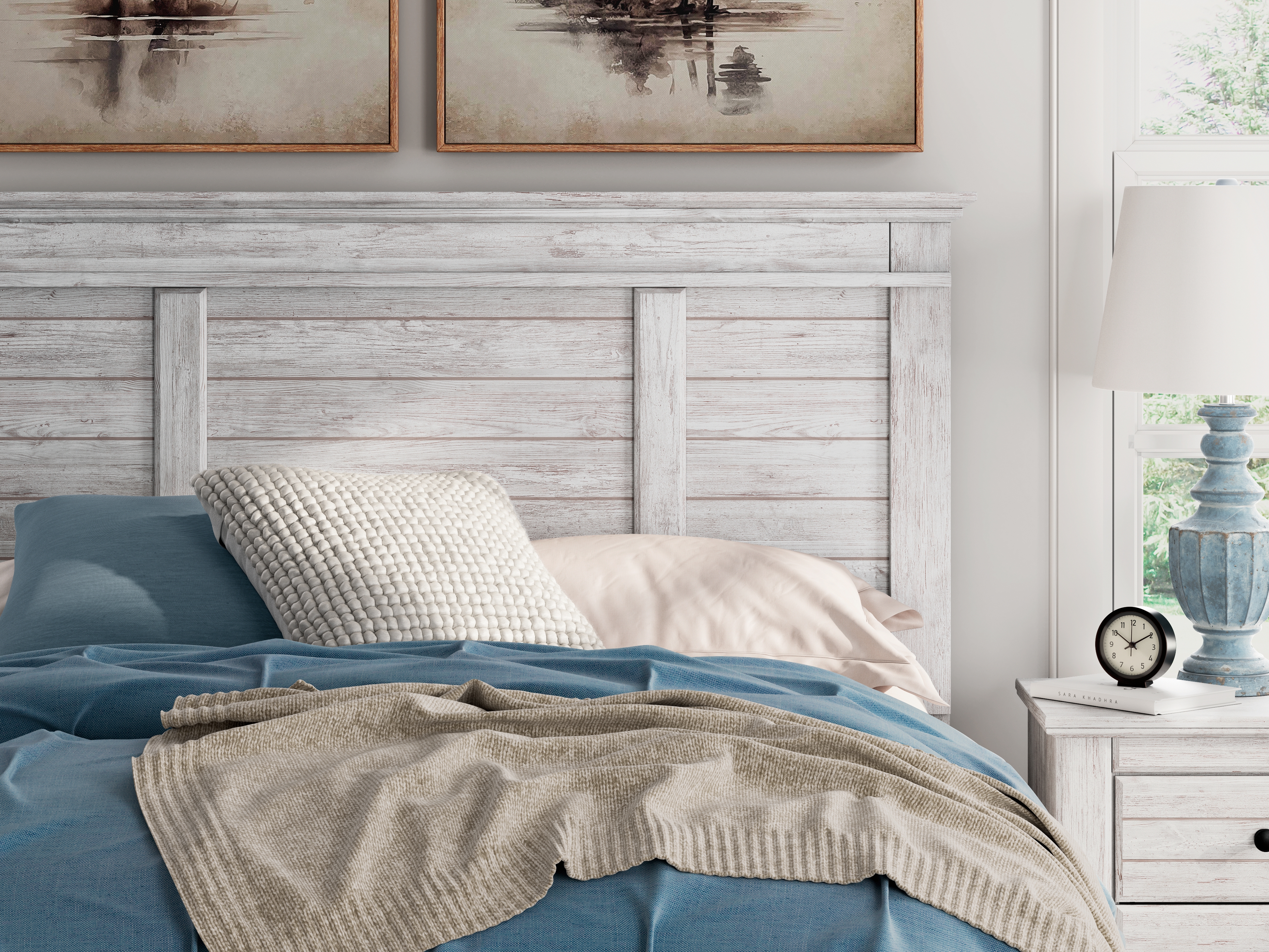 The Makidern Whitewash King Panel Bed by Ashley Furniture brings that same light, easygoing style right to the center of your bedroom, creating a space that feels calm, comfortable, and effortlessly put together. With its soft whitewash finish and subtle wood grain texture, it has a relaxed, cottage-inspired look that brightens the room without feeling overdone.