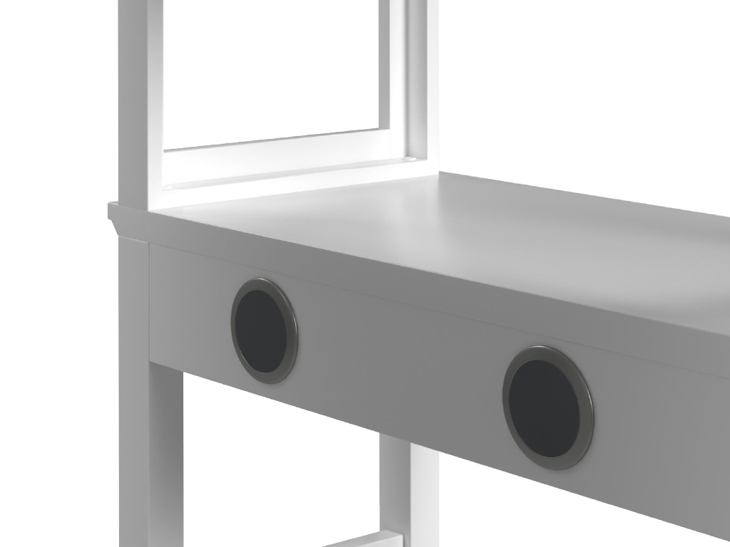 View Product CollectionThe Hampton Kids White Twin Loft Bed with Staircase and Desk with Speakers by Elements International is a clever, space-saving setup that blends sleep, storage, and study into one modern design. Finished in a bright white over-grained oak veneer, this elevated bed brings clean lines and subtle texture to any transitional or contemporary space. Crafted from solid and engineered wood, it offers strength you can count on for years of daily use. The built-in staircase offers a safer, more stable climb than a ladder, and each step features integrated drawers, ideal for organizing clothes, books, or toys. Underneath, a sleek workstation includes two storage drawers and built-in Bluetooth speakers, adding tech-savvy function without sacrificing style. With 13 roll-out slats included, this bed is mattress-ready and box spring-free.