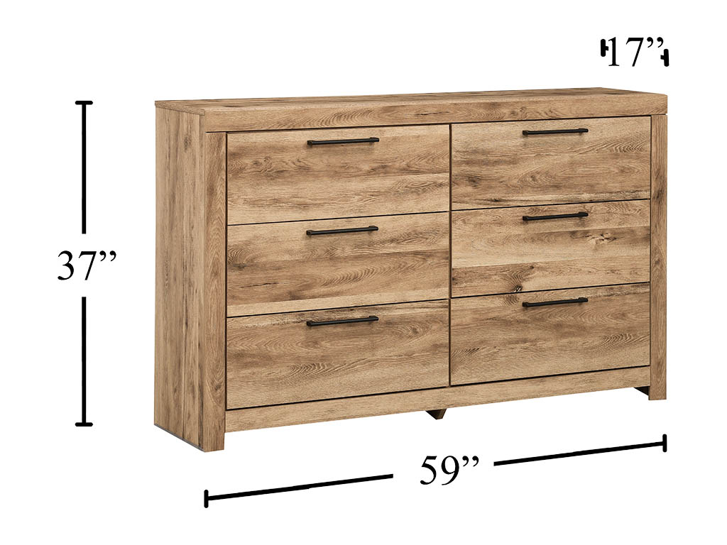 The full panel bed keeps things simple and inviting with clean lines and a golden rustic finish that mimics authentic oak grain. The coordinating dresser adds practical storage with six smooth-gliding drawers, while the matching mirror completes the set with a polished, pulled-together look. Altogether, it’s a smart and stylish trio designed for real life.