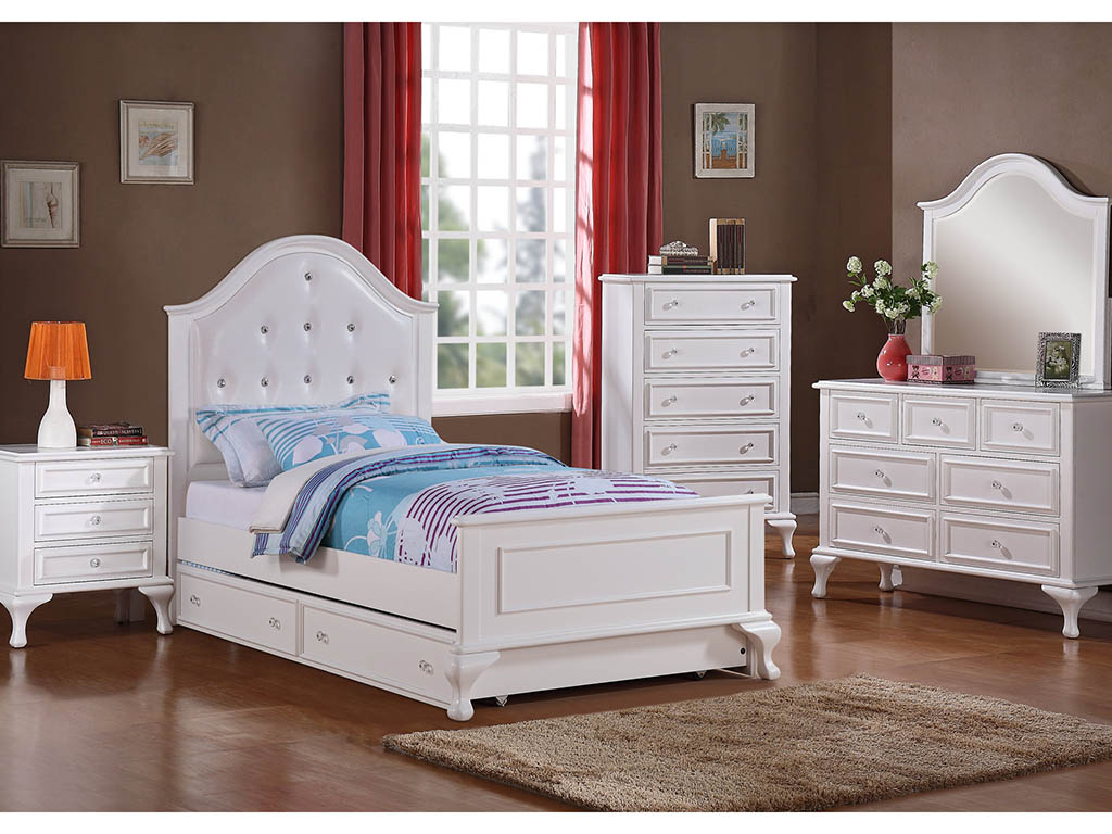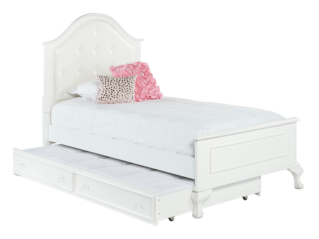 View Product CollectionThe Jesse Twin Panel Trundle Bed from Elements International is a dreamy addition to any child’s bedroom, promising sweet dreams and charming style. Its delicate design showcases a faux leather headboard adorned with chic white buttons, while elegantly arched cabriole feet and intricate moldings add a touch of sophistication. The bed also features crystal-like knobs that make it easy to access the rolling trundle, which doubles as a spacious storage drawer to keep the bedroom tidy and organized. Perfect for Friday night sleepovers, the trundle pulls out smoothly to reveal an extra twin bed, offering ample space for friends and fun.