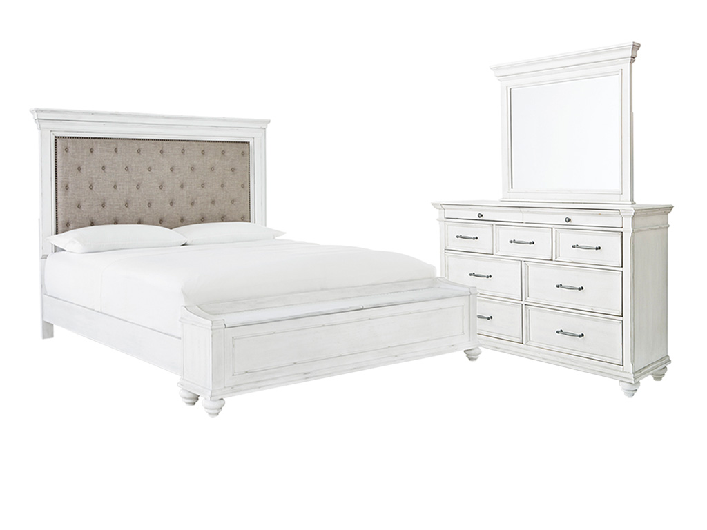 View Product CollectionCreate the vintage retreat of your dreams with this Kanwyn 3 Piece Upholstered Queen Bedroom Set from Benchcraft by Ashley, featuring an upholstered panel bed with storage bench footboard, matching dresser, and framed mirror. Finished in a beautifully distressed whitewash, this set blends timeless elegance with the relaxed charm of a coastal cottage or farmhouse getaway. The queen bed makes a grand centerpiece with its inset button tufted upholstery headboard, generously scaled moulding, and classic bun feet. A bench-style footboard adds both hidden storage and a convenient seating area, perfect for stowing linens or extra bedding. The spacious dresser provides ample room for clothing and essentials, while the matching mirror adds light and depth to your space with its refined, vintage-inspired frame. Each piece is crafted with attention to detail, bringing warmth, texture, and character to your bedroom.