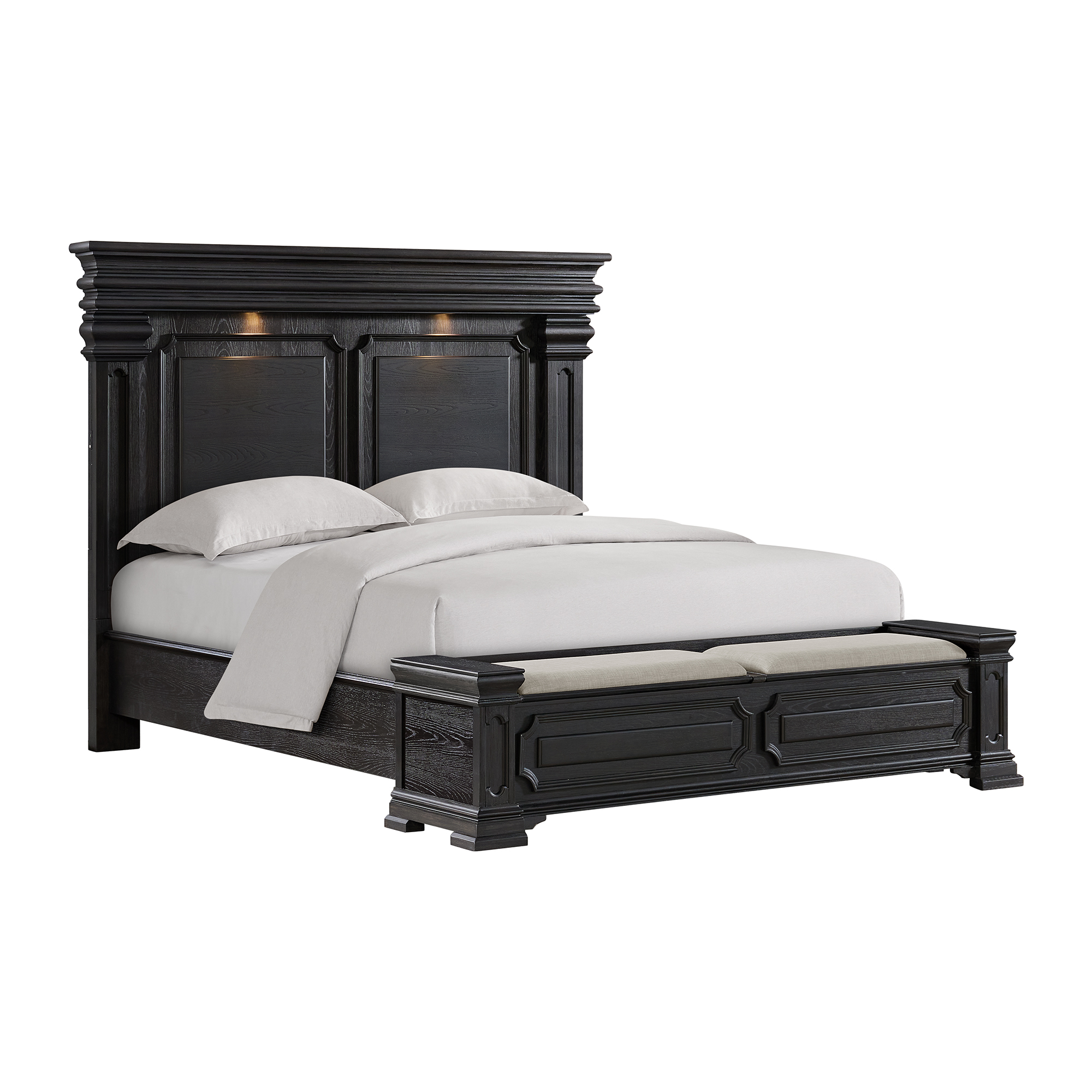 The Kings Court Black King Panel Storage Bed by Elements International brings together timeless style and everyday practicality in a way that just makes life a little easier. With its deep black finish, classic paneling, and detailed molding, it has that strong, traditional presence that instantly gives your bedroom a polished, put-together feel. But this bed isn’t just about looks, it’s designed to work for you, too. The headboard features built-in LED lighting that casts a soft glow, perfect for winding down with a good book or setting a calm, cozy mood in the evenings. You’ll also find convenient USB ports right within reach, making it simple to keep your devices charged overnight without extra cords cluttering your space. Down at the footboard, two upholstered storage drawers offer a smart solution for keeping extra linens, blankets, or seasonal items neatly tucked away but still close at hand. It’s a thoughtful combination of comfort, function, and classic design that fits right into everyday living—now with the added room and comfort of a king-size design.