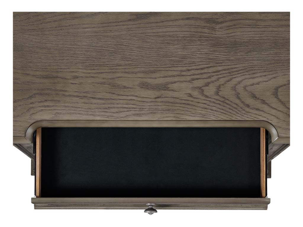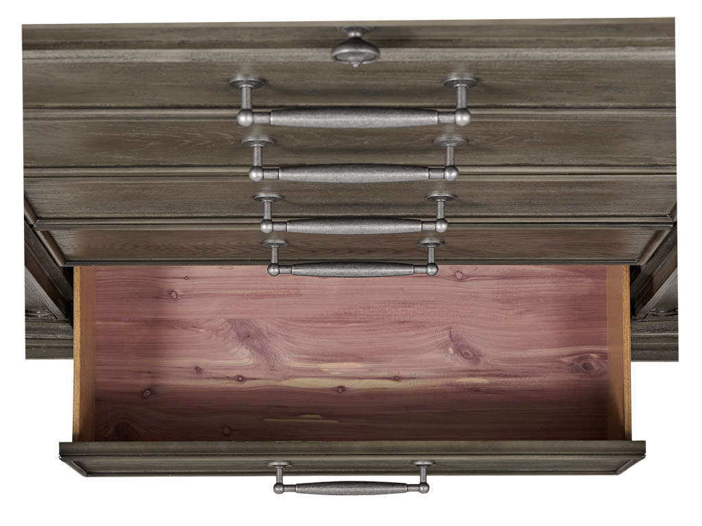 The black felt-lined top drawer provides a luxurious, secure space for delicate items, and the cedar veneer bottom drawer adds a refreshing scent and natural protection for your belongings. With elegant molding and a sleek grey finish, this chest combines timeless charm with modern convenience. The mix of knob and pull handles ensures both style and easy access.