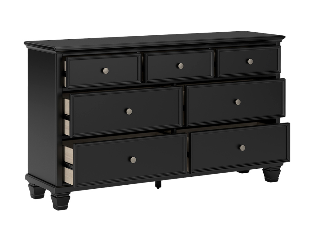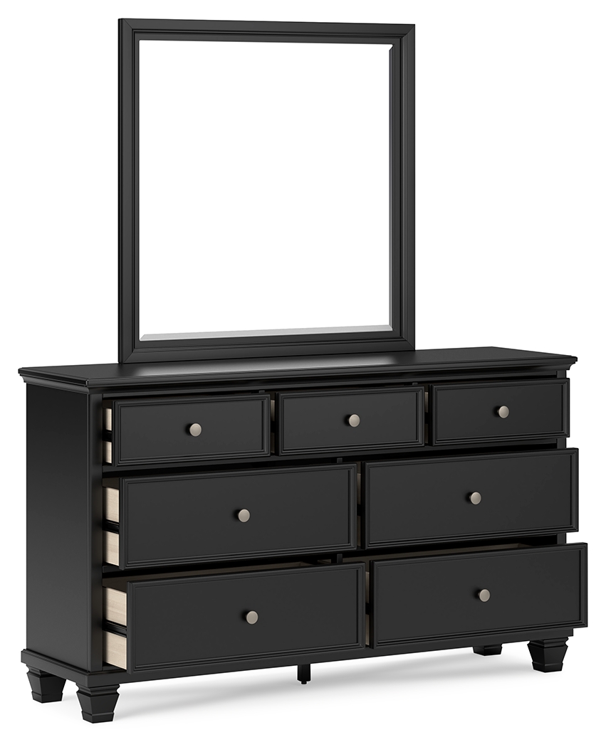 With its timeless silhouette, the Ashley Furniture Lanolee 3 Piece Panel Bedroom Set blends traditional craftsmanship with modern comfort. The bold black finish panel bed anchors the room with its stately headboard and clean-lined footboard, while the dresser and mirror combination provides the perfect balance of storage and style. Whether you’re outfitting a new home, refreshing your retreat, or updating a guest room or kids room, this set creates a cozy, put-together bedroom that feels classic yet fresh. FEATURES & BENEFITS Set includes: Panel bed, 7-drawer dresser, and matching landscape mirror Panel bed design: Stately headboard and clean-lined footboard for timeless appeal Bold black finish: Sleek and versatile, adding depth and a modern touch to any room Durable craftsmanship: Built with engineered wood and veneers for long-lasting strength 7-drawer dresser: Smooth-gliding drawers offer ample storage space for clothing and essentials Classic hardware: Elegant metal knobs in a burnished finish for a touch of sophistication Matching mirror: Wide framed mirror enhances light and completes the bedroom set Adjustable base compatible bed: Works seamlessly with an adjustable base (sold separately) Box spring required: Provides essential mattress support (sold separately)