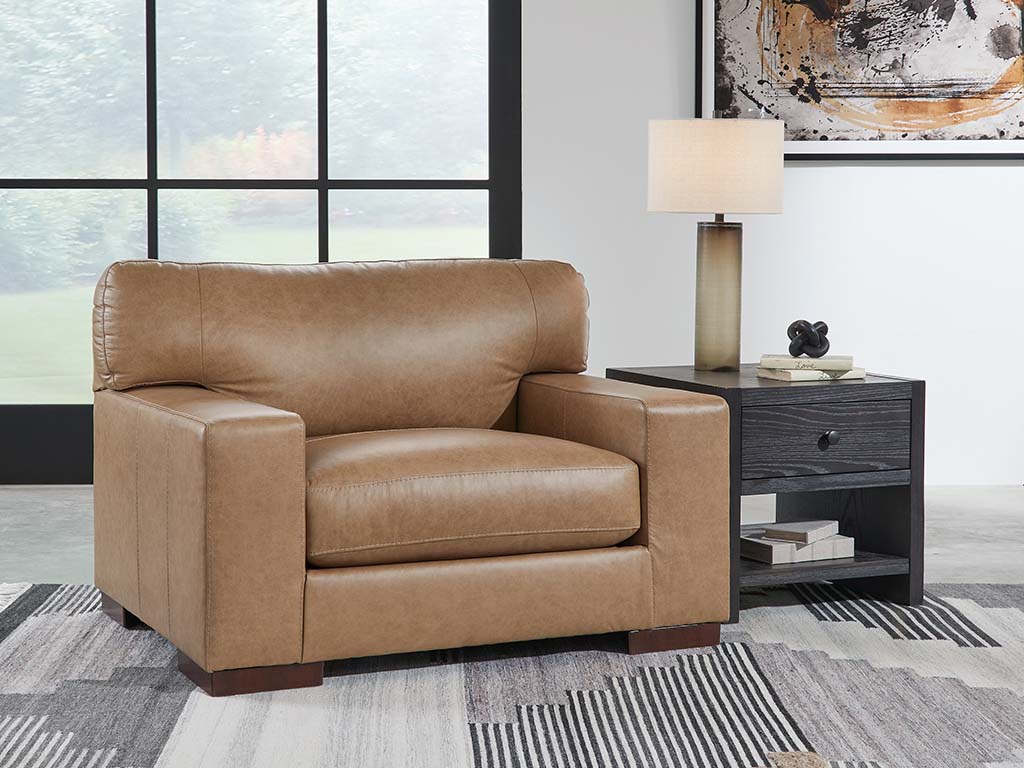 View Product CollectionThe Lombardia Tumbleweed Leather Chair And A Half by Signature Design by Ashley offers an oversized seating option crafted with elevated comfort in mind. Its combination of leather and faux leather match upholstery provides both durability and a luxurious look and feel. Designed to exude sophistication without compromising affordability, this chair boasts high design aesthetics at a reasonable price point. Whether used as an inviting accent chair or paired with the matching ottoman for ultimate relaxation, the Lombardia chair & 1/2 is sure to be a rich and stylish addition to any home, enhancing both comfort and aesthetic appeal in equal measure.
