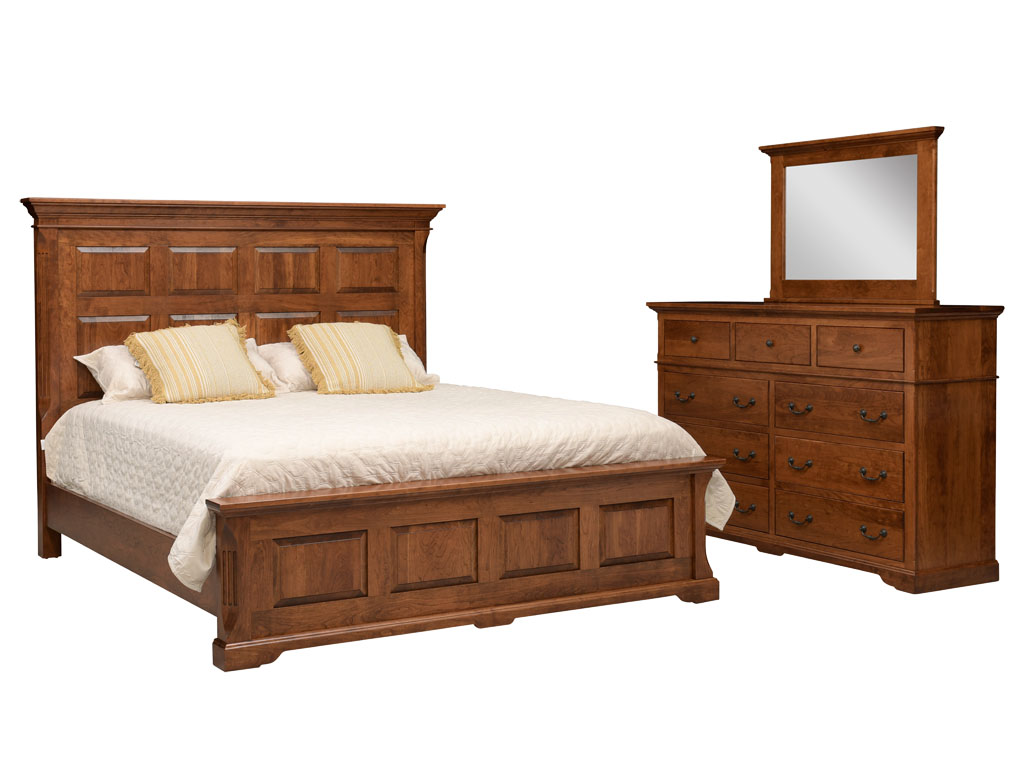 View Product CollectionThe Longmeadow Michaels 3-Piece King Panel Bedroom Set with Dresser and Mirror by MAVIN is the ultimate combination of style, craftsmanship, and functionality. This stunning set is handcrafted from solid rustic cherry wood, showcasing the natural beauty of the wood grain, enhanced by the warm Michaels stain. Designed to complement both traditional and contemporary interiors, this set features a King Panel Bed, a matching Dresser, and a large Mirror that brings elegance and sophistication to your bedroom. The King Panel Bed features a refined panel headboard and footboard with classic inset panels and chamfered edges. The clean lines and sturdy construction ensure this bed becomes a lasting centerpiece in your bedroom for years to come. The Dresser offers ample storage space with multiple drawers for clothing and personal items, while the Mirror adds light and depth to the room, beautifully reflecting the room’s décor. Built with MAVIN’s commitment to quality and attention to detail, this 3-piece set allows for customization in a variety of wood species, stains, and finishes, enabling you to create a personalized look that fits your unique style and home.
