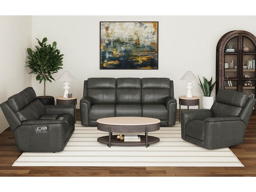 View Product CollectionThe Mustang Aline Anthracite Grey Leather Triple Power Reclining Sofa by Elements International delivers comfort and function with a touch of timeless style. Designed with a Leather/Leather Match covering, this piece features supple 100% top-grain leather in all seating areas for a soft, luxurious feel, while the sides and back are upholstered in a skillfully matched material for added durability and value. The rich anthracite grey tone offers a sleek, versatile look that pairs beautifully with both warm and cool palettes, making it easy to style in any space. Generous foam cushioning with pocket coil seating provides long-lasting comfort, while power recline, headrest, and lumbar functions let you customize your position with ease. At the center, a drop-down table reveals built-in wireless charging and dual cupholders—perfect for keeping your devices powered and your drinks steady during movie nights. Subtle tufting and tailored stitching complete the look, giving this sofa a polished finish that works well in both classic and contemporary settings.
