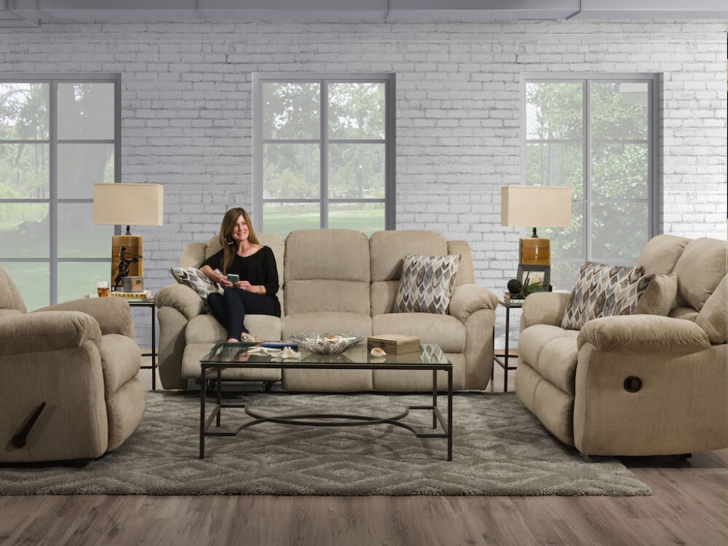 View Product CollectionKick back and relax in style in the Newport Fawn Double Reclining Loveseat by Homestretch. It features plush, pad over chaise seating, solid foam arm pads, and is covered in 100% polyester, making it extremely easy to keep clean. The casual contemporary styling and neutral tan fabric make it versatile enough to go with any design style and color palette effortlessly. Two accent pillows are included to further enhance the look and add comfort.