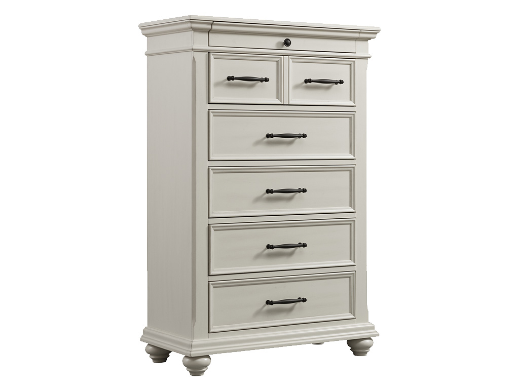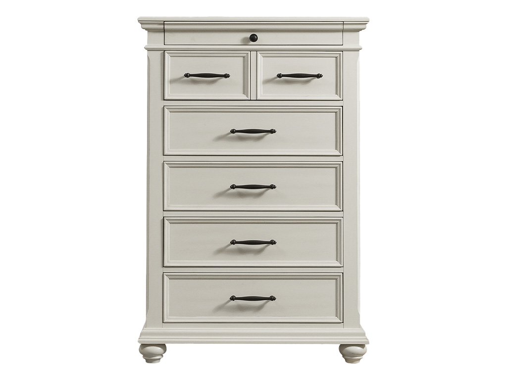 View Product CollectionThe Slater Antique White 6 Drawer Chest by Elements International is the perfect blend of style and practicality for your bedroom. This vertical chest offers six spacious drawers, including a top drawer lined with black felt, ideal for safely storing delicate items. The off-white finish beautifully complements the dark metal drawer hardware, creating a classic and timeless combination. Beveled edges and bun feet enhance its traditional style, making it a versatile piece that seamlessly fits into various décor themes. Bring home this charming chest today and enjoy its elegant design and functional storage every day!