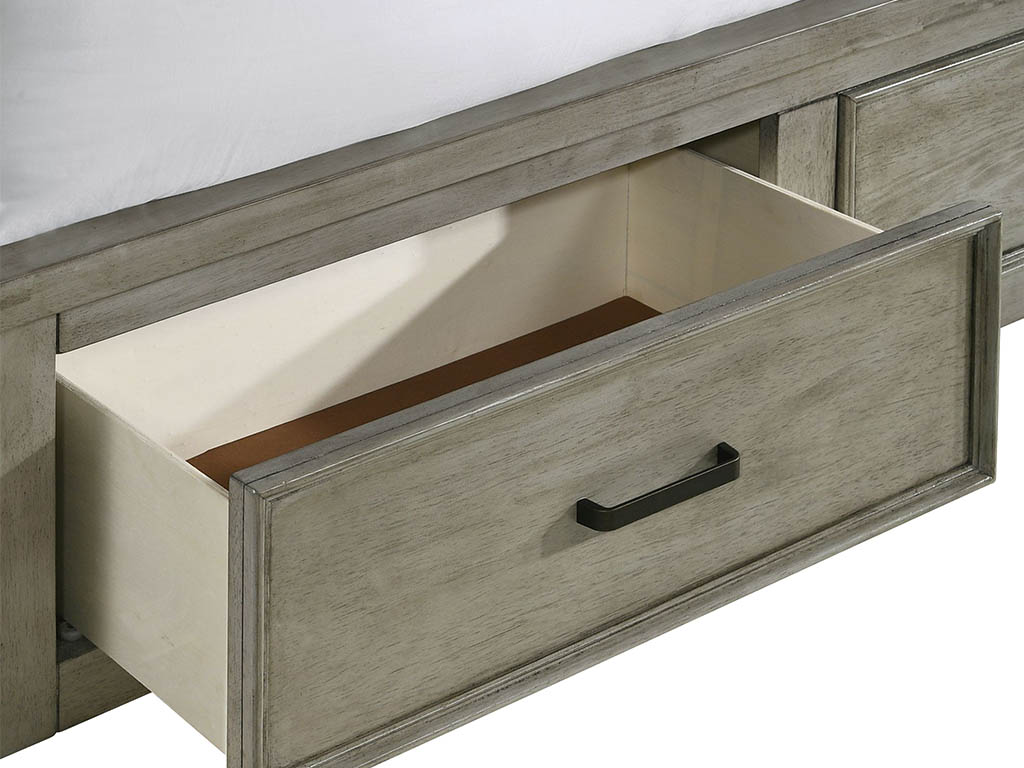 View Product CollectionThe Sullivan 6 Drawer King Storage Bed from Elements International is a super functional piece, perfect for maximizing space in any bedroom. Featuring a storage footboard with two spacious drawers and two additional drawers built into each side rail, this platform storage bed offers ample room for storing extra linens, blankets, and other essentials. It’s an excellent small-space solution, utilizing every inch efficiently. The bed’s Drift Grey finish pairs beautifully with bronze drawer pulls, creating a sophisticated look that blends effortlessly into various design styles, from modern to transitional.